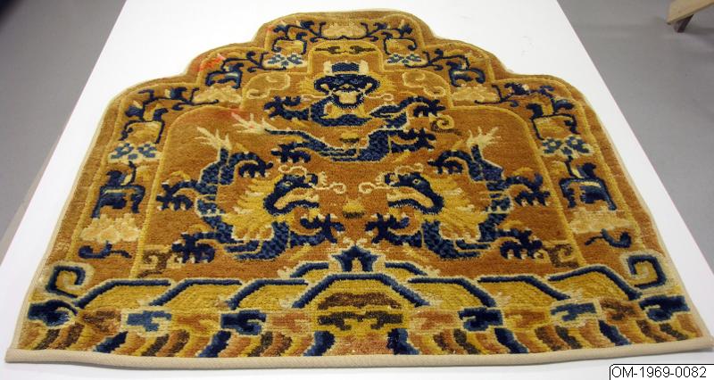 • Stolsrygg av ylle. Drakar i blått mot gul fond. 1800-tal.