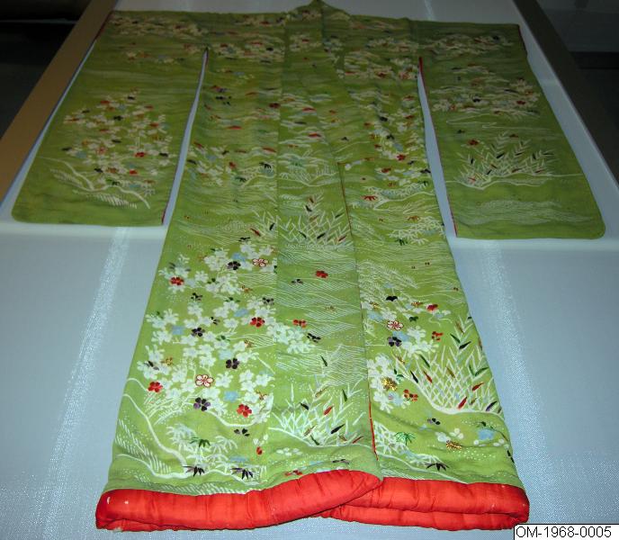 • Kimono av furisode-typ i grönt siden med vadderad fåll. Dekorerad med blommor och landskap i färger. 1900-tal.