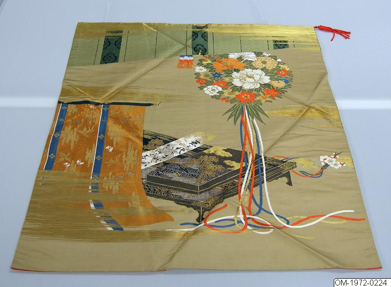 Fukusa (presentduk) med blomdekoration i brokad mot röd fond och lackbord, textil mm. 1900-tal. Presentduk (fukusa) med motiv av blomsteruppsättning i form av boll vid lackbord med skrivask, jalusi och draperi. Mönstervävt siden med metallinslag. Eventuellt 1960-tal. /PH