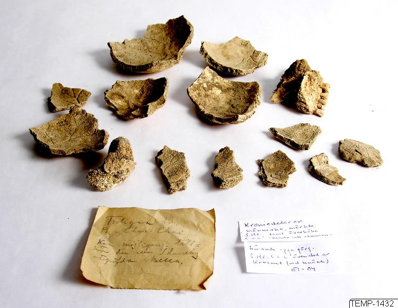 Från Elisabet Iregrens anteckningar:”Seven cranial fragments and a severely fragmented distal part of femur XXX all marked with S.H.S.C.C.C. A total of 10 skull vault fragments, sized 3-12 cm, not possible to reconstruct. Middle aged adult but below ca. 55 years. Note: “Probably from Pu-chao-Chai. May possibly belong to the excavation performed by Zdansky.” Mer info se dokumentation.