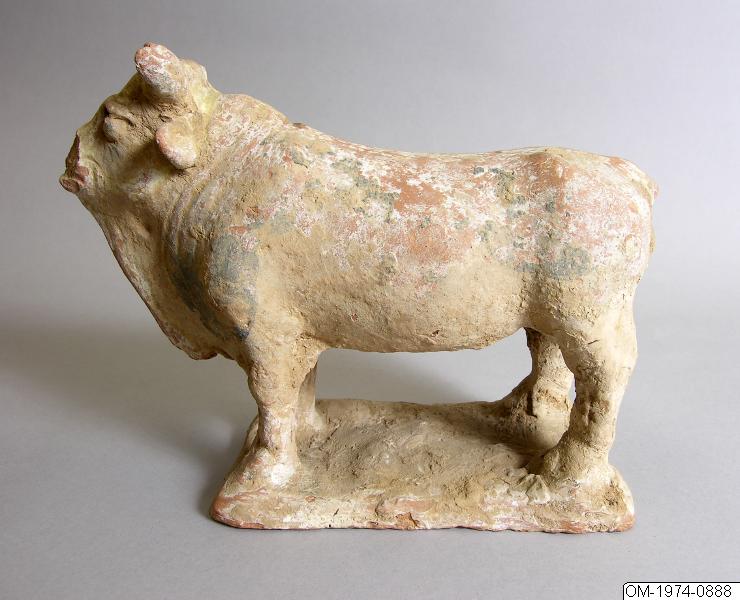 Enligt katalogkort: Figurin av tjur med spår av bemålning i svart och gult. Material: tegelrött lergods. Tillverkningsort: sannolikt Henanprovinsen