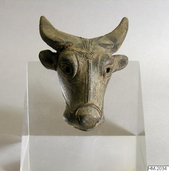 Enligt katalogkort: Oxhuvud med nosring och grimma.Material: Grå bränd lera.Närmare tidsbestämning: Wei.