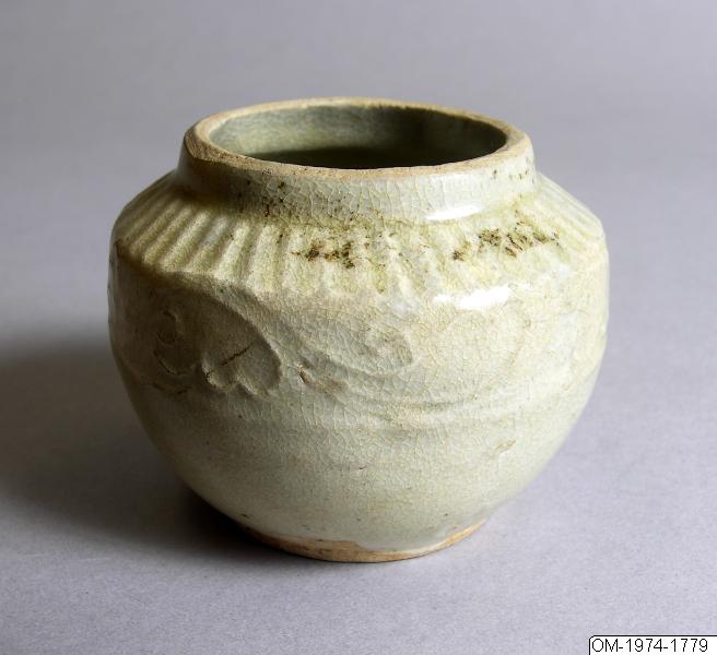 This small jar is decorated with stamped designs and was probably originally covered with a lid. Right below the neck, the slanting shoulders bear an impressed pattern that resembles the petals of a chrysanthemum flower. The pattern is combined with a band of stamped floral or vegetal scrolls in bas-relief encircling the upper part of the round-shaped body. The base, without a clear cut footrim, has a slightly concave shape. The mouthrim was wiped free of glaze before firing. The base, as well as the surrounding area on the lower body, has not been glazed, and the exposed body material oxidised to a reddish color during firing. The olive-tinged glaze is finely crackled. Fine kiln grit, or some other impurity, was stuck on the vessel before firing, near the shoulder and foot, leaving behind black speckles. A mark in the glaze, presumably from the potter's finger is visible on one side.