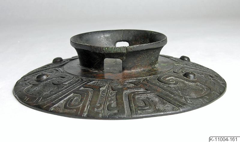 Lid of gui, with ring-shaped knob which might serve as a foot if used as serving dish. Two square holes, opposite each other, in the knob ring. The lid is decorated with four birds against a background of spirals. Inscription of 19 characters (the 15th unidentified) Translation (cc. to B. Karlgren, transcripition modified): “The prince of Ji [by name] Mozi set apart treasures for Lady Jiang of Ji, and he made a gui; Lady Jiang of Ji [by name] Shi, with it ..., and with it prayed for a myriad years (BMFEA, 21, p. 9)