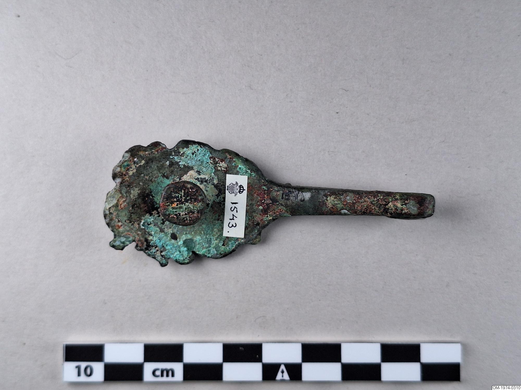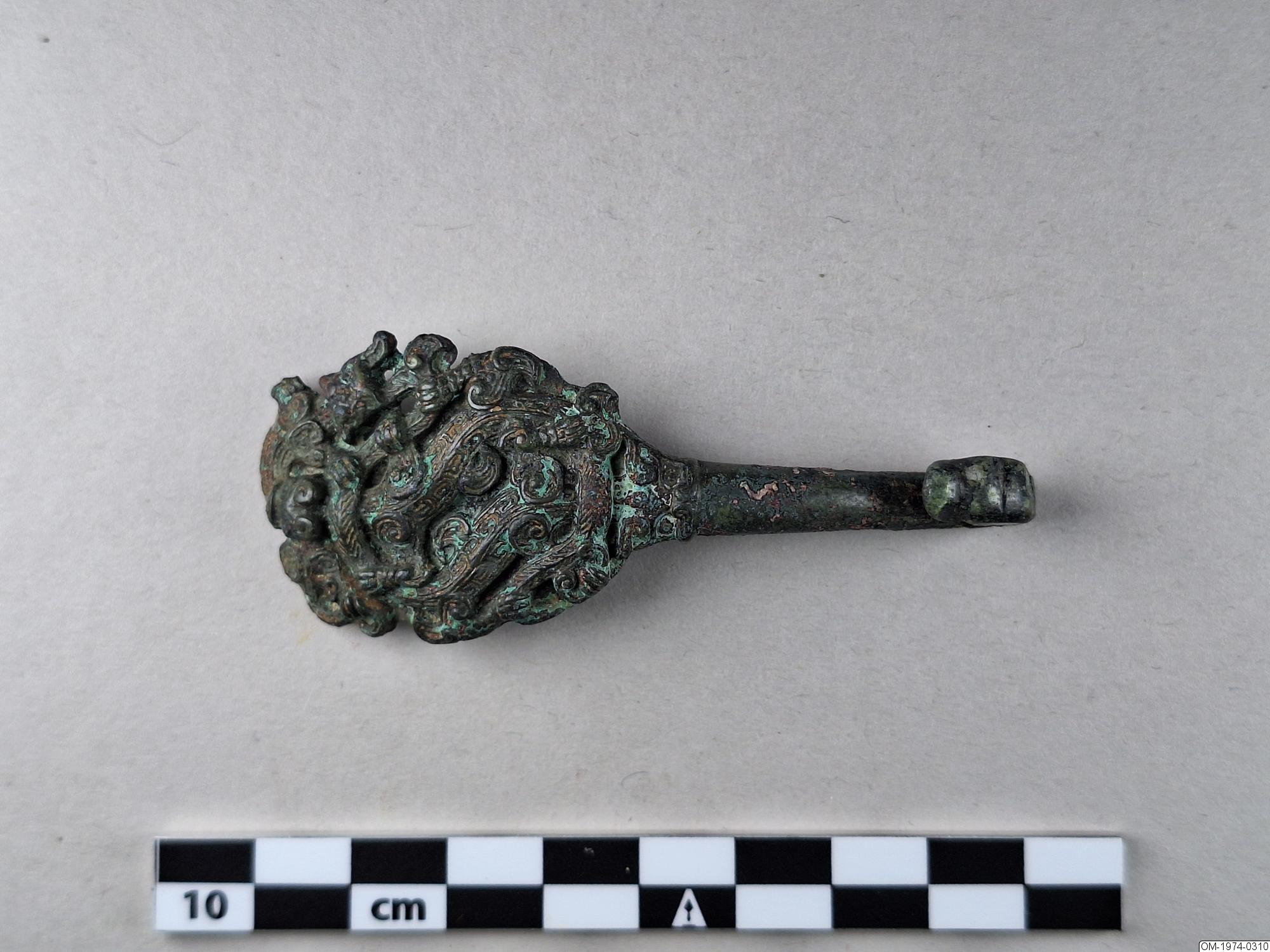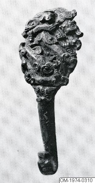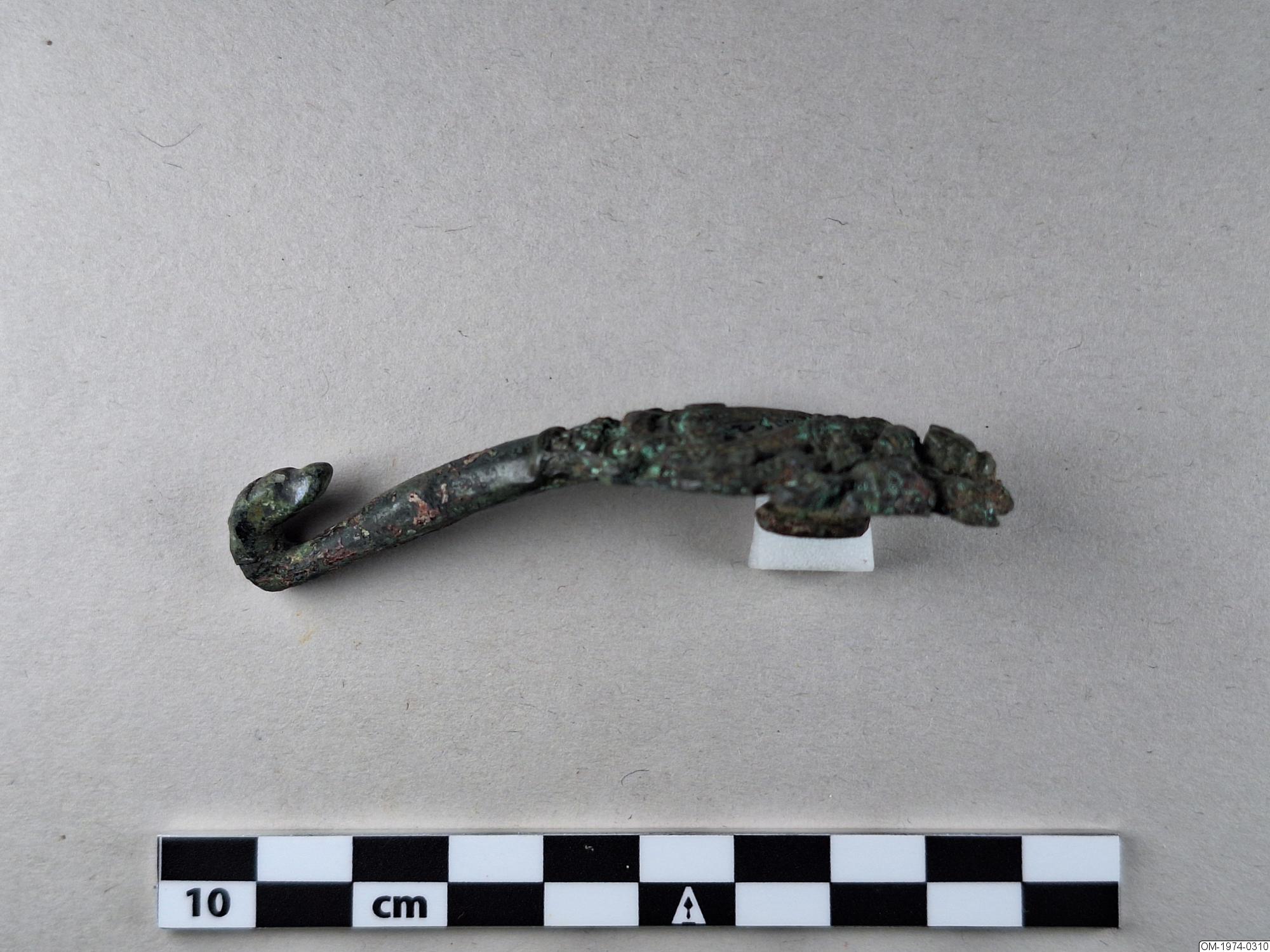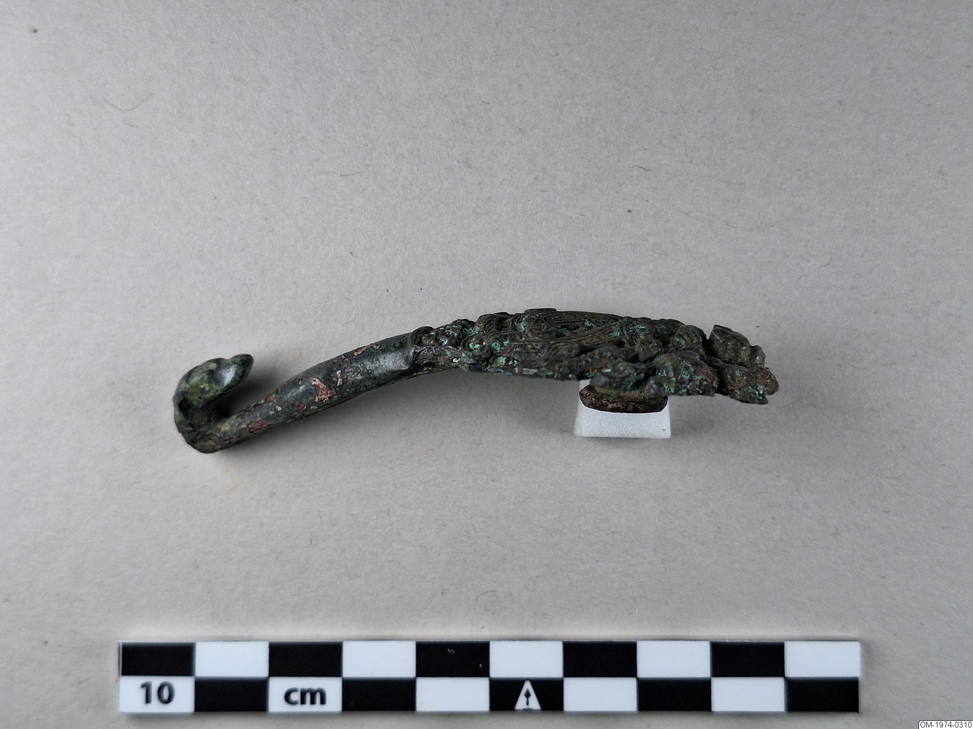 Enligt katalogkort: Dräkthake med komplicerad drakdekor. Material: Mörkgrått patinerad brons med smärre malakit krustor.