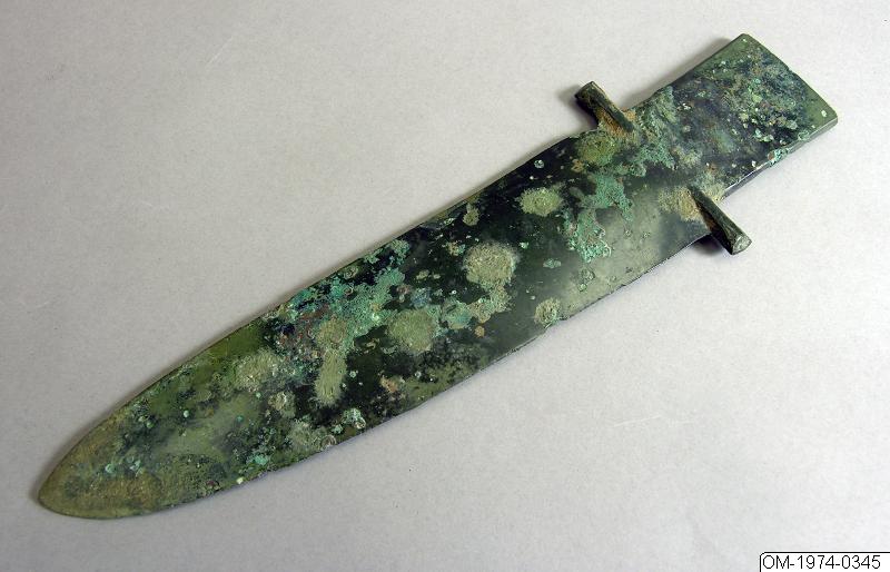 Enligt katalogkort: Bronsdolk m. brett blad o kort, fyrsidigt fäste.Material: brons, mkt. vackert grönpatinerad.Närmare tidsbestämning: Tidig Zhou-tid.