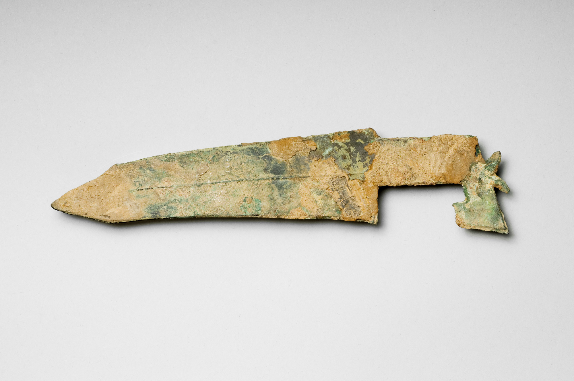 Enligt katalogkort: Dolkyxa av tunn plåt med förenklat drakhuvud vid tången. Material: Brons med fläckig ljusgrön patina. Tillverkningsort: Anyang Närmare tidsbestämning: Yin- tidig Zhou.