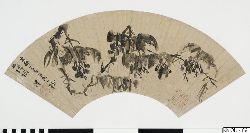 "Klängande vinranka". En lång gren med hängande blad och druvklasar. Solfjädersmålning i tusch på förgyllt papper.