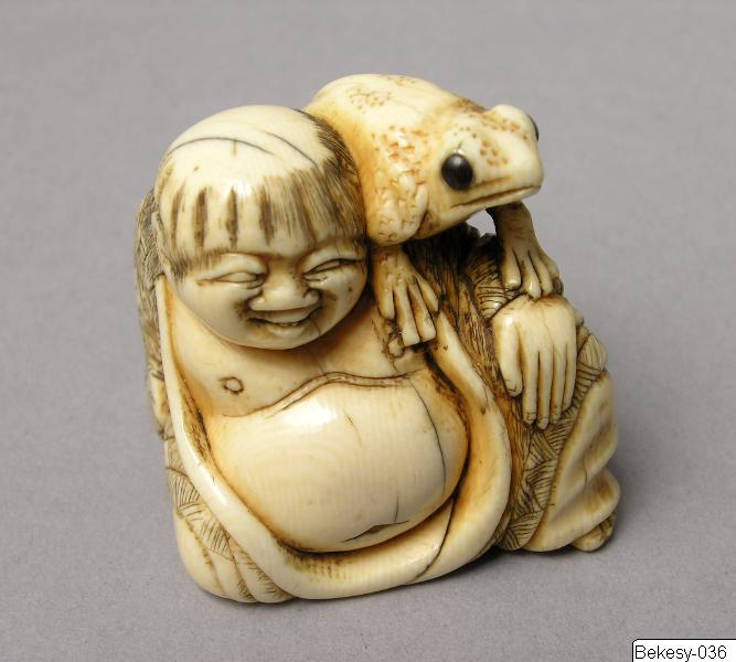 • Netsuke av elfenben: Gama-sennin med sin padda på skuldran.