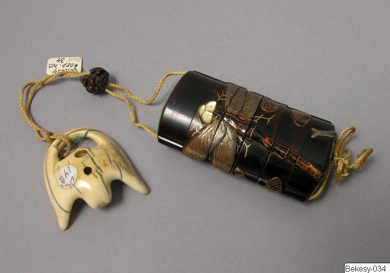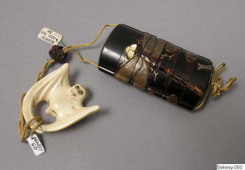 Netsuke i elfenben och glas, föreställande en fladdermus. Hör ihop med Bekesy-034. Kimonon har inga fickor, småsaker kunde läggas i ärmarna och innan för bältet och så kunde man bära olika dosor, pipor och penselfodral på en snodd från bältet. De bärbara sakerna kallas sagemono. Accessoarerna blev särskilt för männen identitetsskapande statusföremål och en viktig del av herrmodet, en egen värld i mindre skala med rika motiv. Olika typer av konstnärligt utformade sagemono är kända fr o m 1600-talet. Förutom tobaksrelaterade dosor är en av de mer kända typerna sigilldosor (inro). Bokstavlig betydelse är en korg (ro) att lägga sigill (in) i. Enligt lag var endast stämplade signaturer giltiga vilket krävde att t ex samurajer och köpmän som hade behov av sigillstämplar fick bära dem med sig i små dosor. Detta var ursprunget till sigilldosor (inro) som snart främst kom att användas för medicinförvaring. Utseendet på accessoarerna varierade efter bärarens smak, ekonomi och modetrender. När västerländsk klädsel med fickor blev populär under Meiji-perioden (1868-1912) minskade behovet av dessa bärbara föremål och de delades ibland upp i sina beståndsdelar (netsuke, s k bältesknappar) för sig och såldes till västerlänningar. (Baserad på text från utställningskatalogen Japan. Föremål och bilder berättar. 2011). Miniatyrskulpturerna (netsuke) rymmer en hel värld att utforska. Myter är ett stort motiv. Ofta var designen skyddande, lyckobringande och inte minst underhållande. Netsuke-föremålets funktion består i att vara en motvikt till de "hängande saker" (sagemono) som bars till kimonon av männen. Vanliga hängande saker var olika dosor, till exempel medicindosor (inro) och tobakspungar. Netsuke betyder ungefär "fästa rot" och tidiga netsuke (före sent 1600-tal) var förmodligen naturliga, obearbetade rötter och liknande. Från 1700-talet gjordes de mer föreställande och ofta i trä eller elfenben. Så småningom började konstnärerna att signera sina netsuke. (Baserad på text från utställningen Japan. Föremål och bilder berättar. 2011). /PH