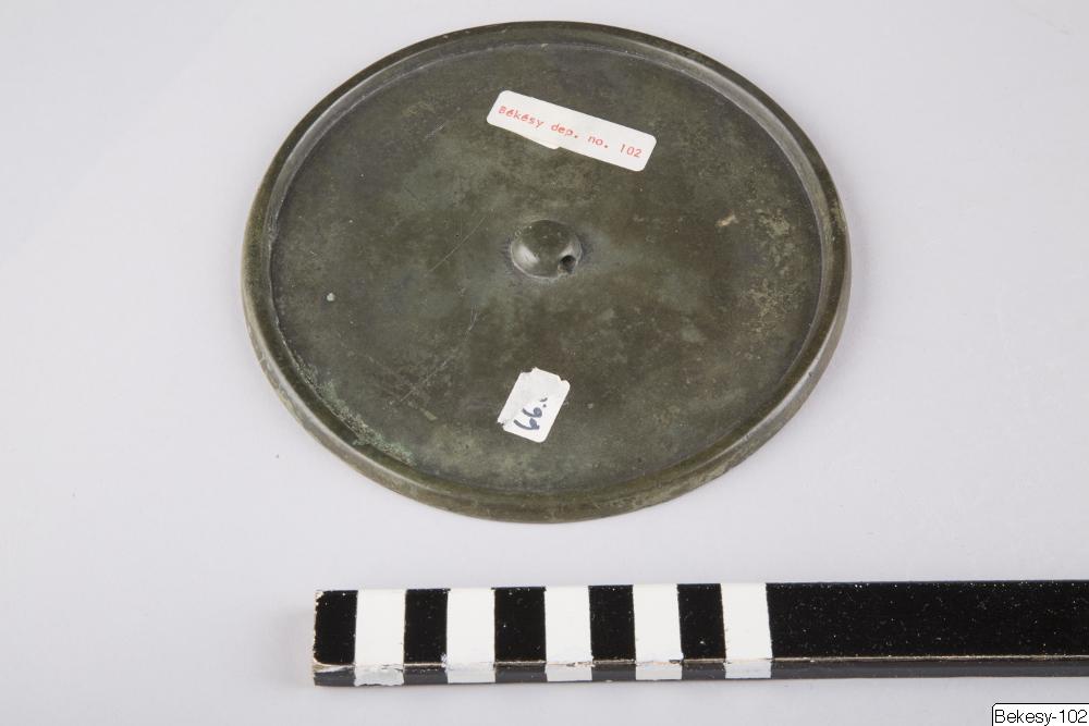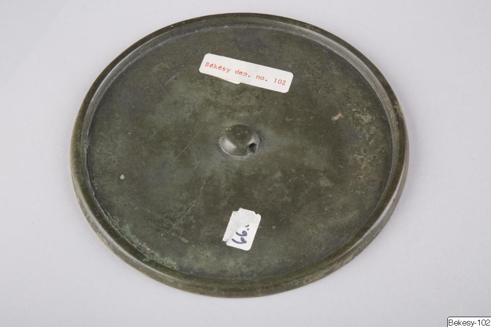 This round mirror was cast in bronze. The back of the mirror has a raised rim along the edge and a knob at the center. The knob has a hole which facilitated the tying of a tassel that was used to grip...