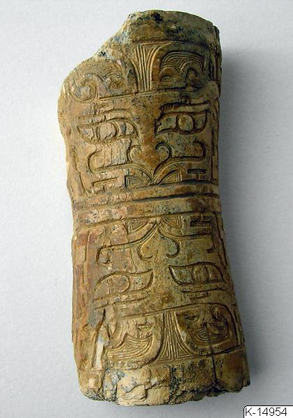 Fragment av ben, från Kina. Fragmentet är välvt och på utsidan dekorerat med inskurna mönster föreställande taotie-masker. På baksidan finns en etikett med påskriften “H 1228”.