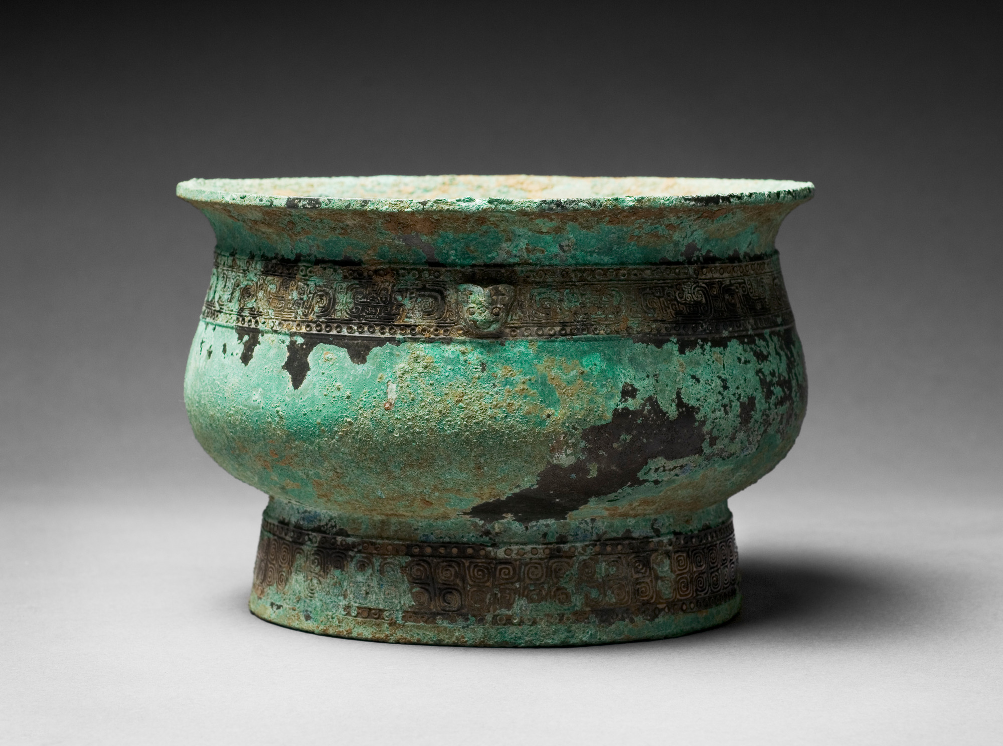 Gui - sacrificial food vessel. Bronze. S-formed profile, straight foot. The body decorated in relief with taotie-masks formed by antithetical dragon against a background of "cloud and thunder"-pattern (yunleiwen), transition body/neck decorated with diamond pattern with two small attached animal heads, the neck with a band of "rising blades" with cicada pattern. Around the foot band of dragons against a background of "cloud and thunder"-pattern above a diamond pattern. Inscription: Ju. Shang, middle Anyang period, 12th Cent. B.C. Glossy black patina covered by green incrustations.