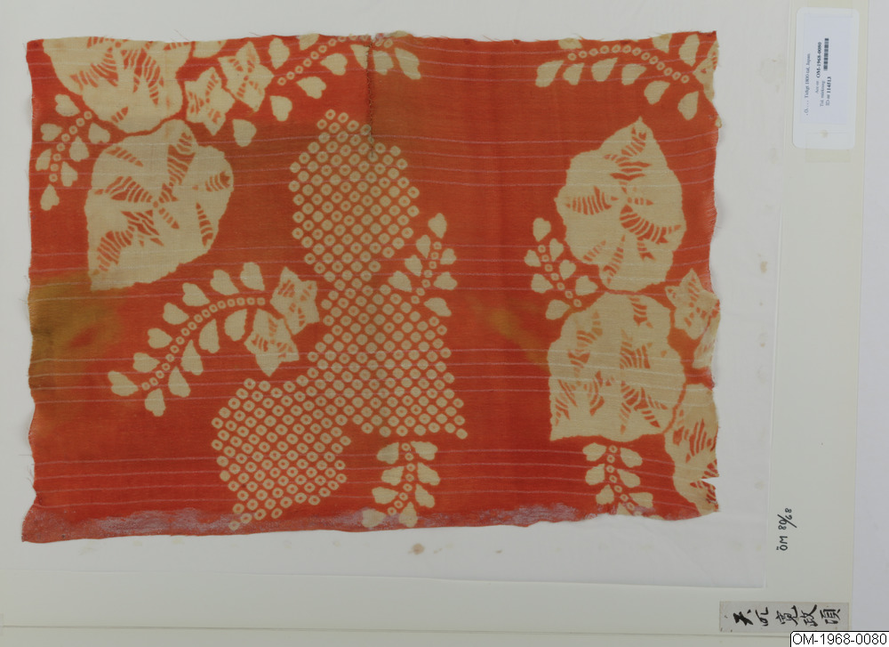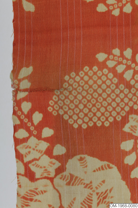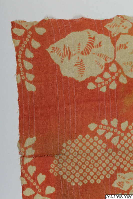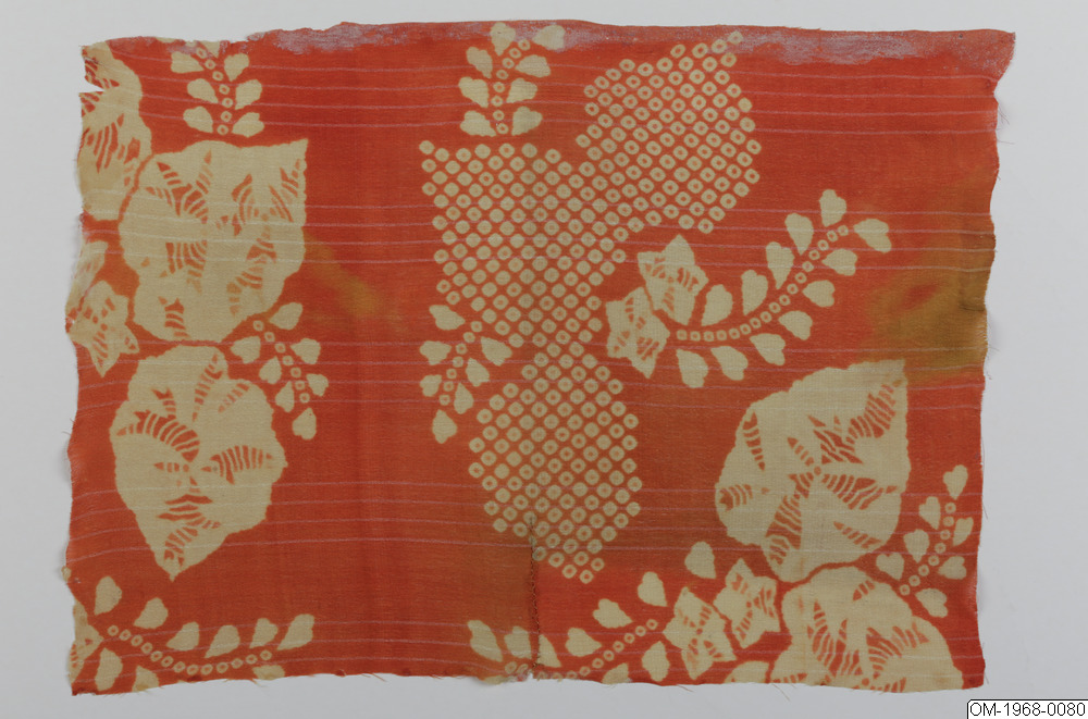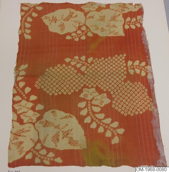 Textilfragment av varmröd sidencrepe. Reservagemönstrat motiv av paulowniarankor. Ljusare varptrådar bildar ljusorange ränder. Enligt uppgift från Temmei-eran (1781-1788).