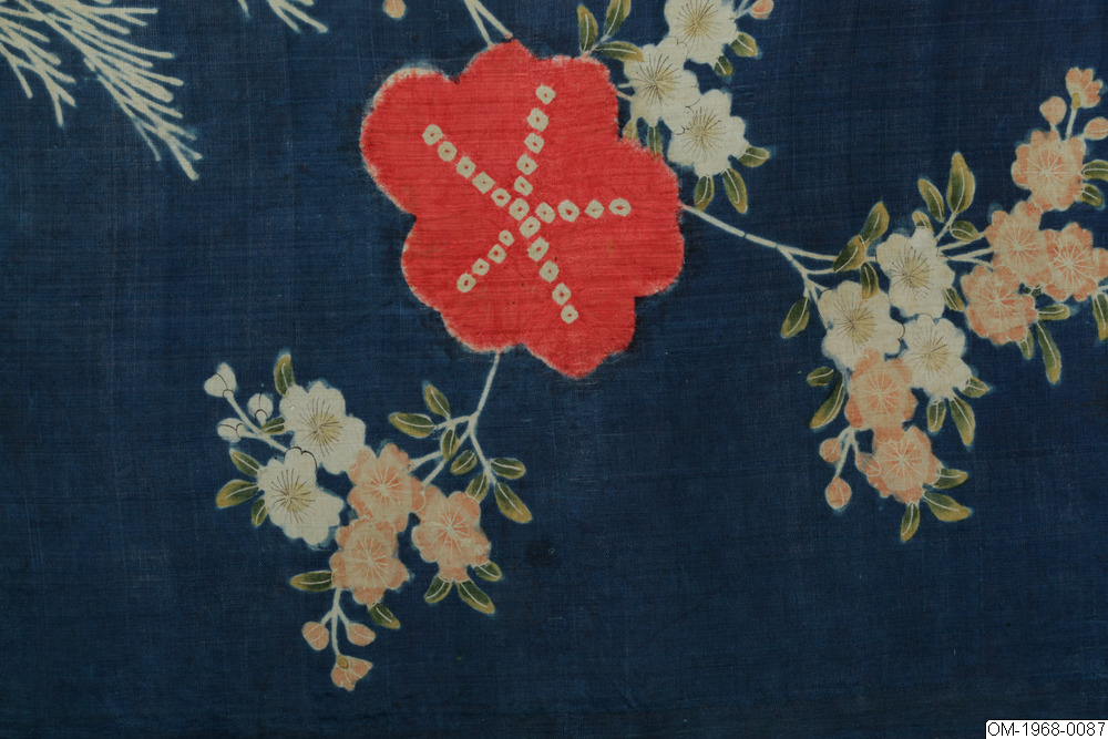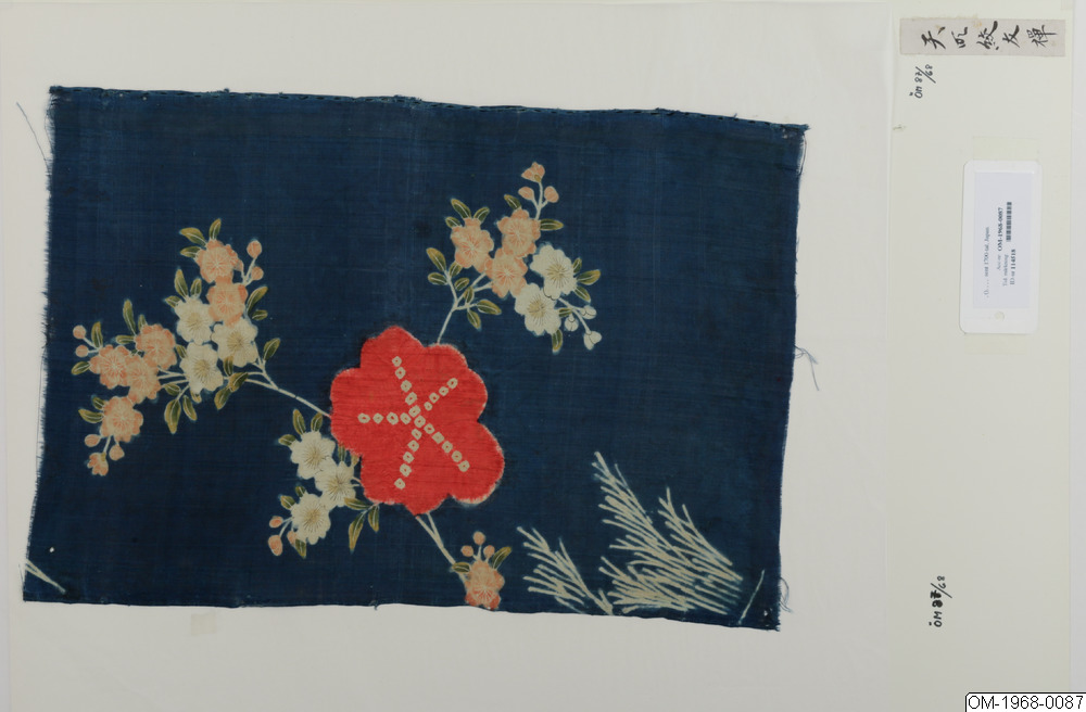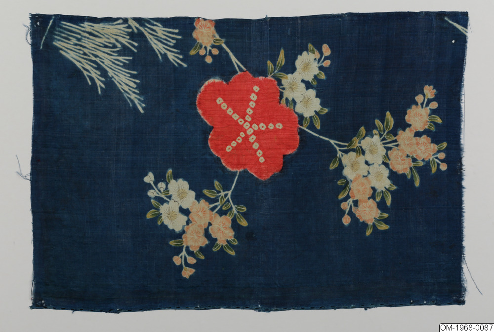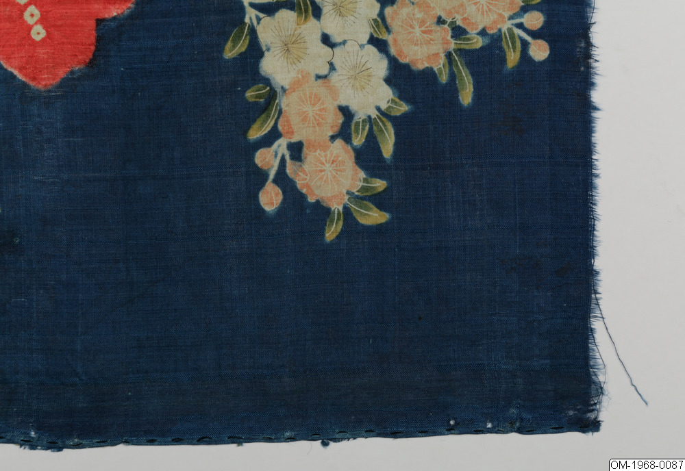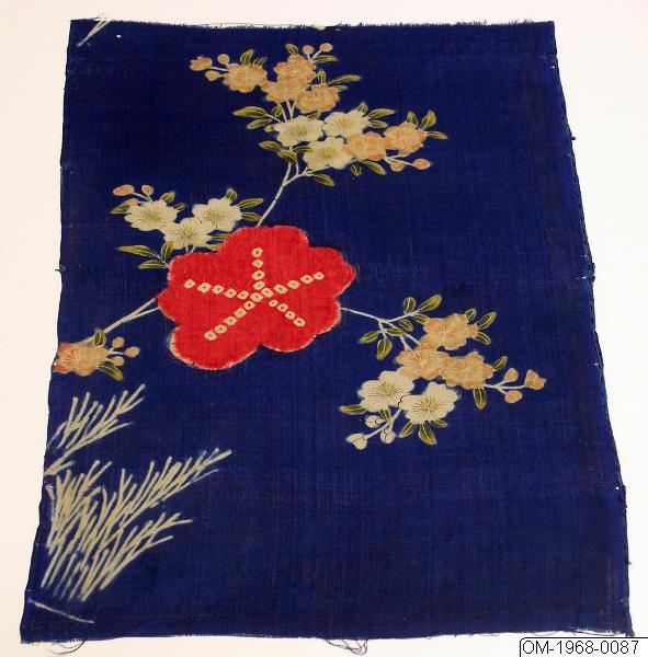 Textilfragment av mörkblått tuskaftat sidentyg med dekor av körsbärsblomkvist med ljusrosa nyanser samt en stor röd blomma ocjh ljusa grässtrån. Reservagemönstrat (shibori, schablon = katazome) samt bemålat. Enligt uppgift från Temmei-eran (1781-88). Den röda blomman är mer stiliserad än övriga motiv.