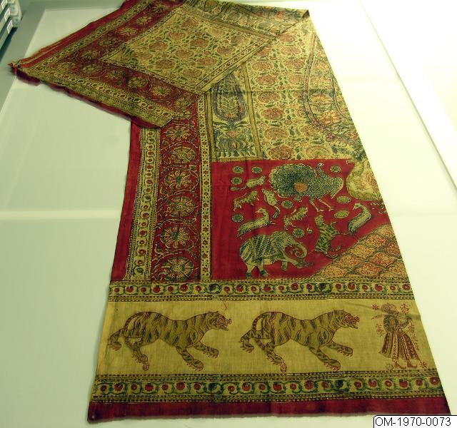 Tryck på bomullstextil, rött, svart, grått tryck på begie botten. Ornament , tigrar, elefanter och andra djur.