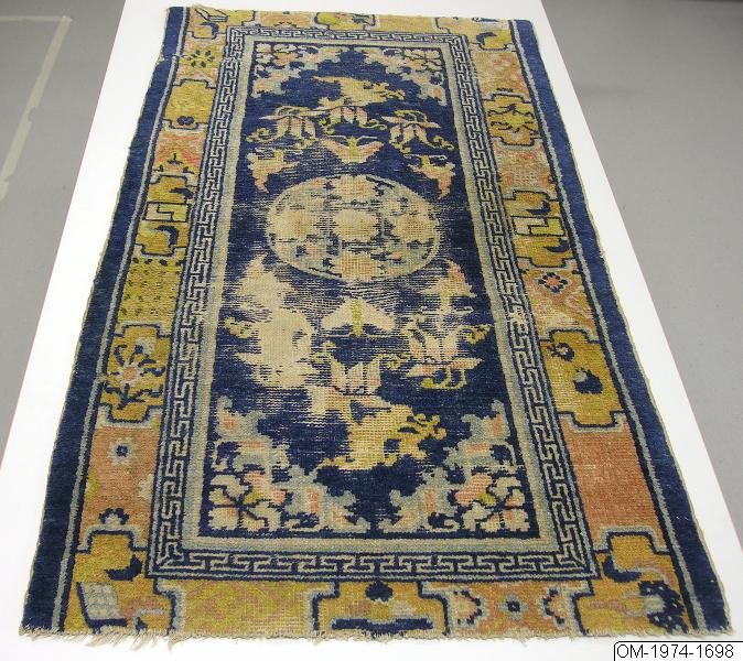 Enligt katalogkort: Liten matta, rektangulär, i blått, vitt, gult och rödgult. Material: Ylle