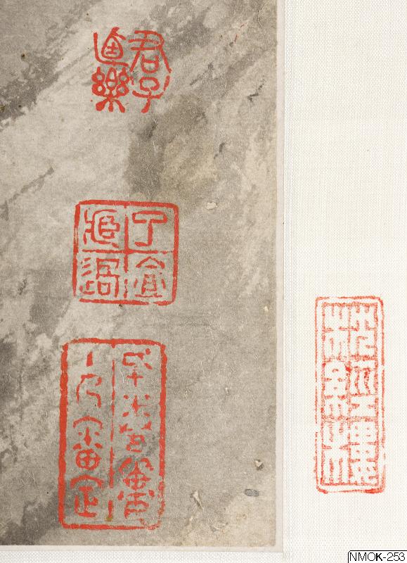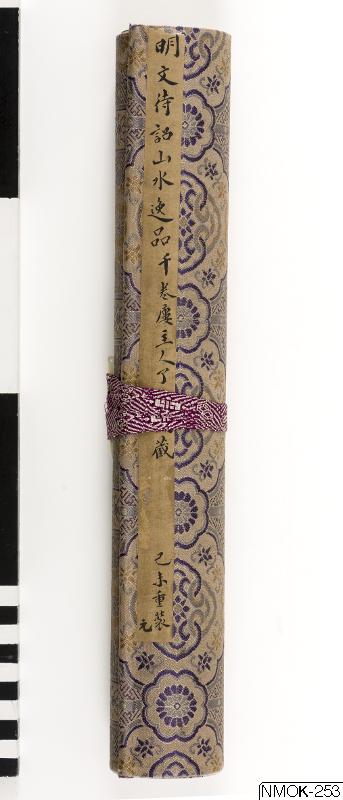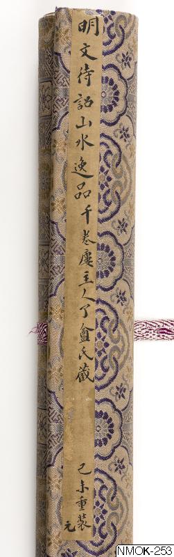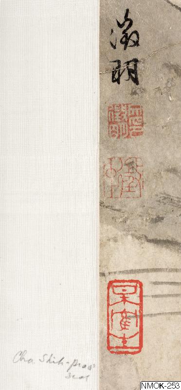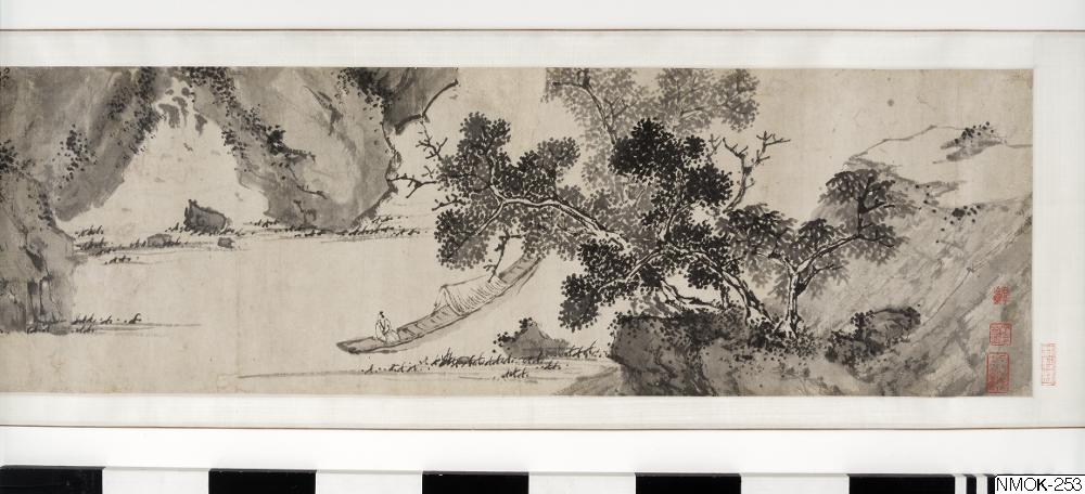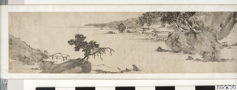 "Flodlandskap." Ett brett vattendrag sträcker sig diagonalt över bilden. Det ses uppifrån; stränderna är antydda med några klippor och träd, placerade i de två motsatta hörnen av målningen. Kort horisontalrulle. Tusch på papper. Försedd med sex sigill, av vilka åtminstone tre är