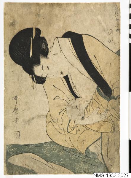 En mor som ammar sitt barn. Enligt Collia-Suzuki 2009 ur serien Furyu nana Komachi, som visar scener som på något sätt är förknippade med den kvinnliga poeten Ono no Komachi (ca 825 – ca 900). Denna bild representerar ”friarepisoden” i Komachis liv. Något mörk och allmänt sliten. /PH