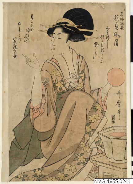 Träsnitt, oban-format. Hachijo från Takakura. Diktillustration, enligt Publicerat: ”Illustration of the poem Kwacho Fugetsu (Flower, bird, wind, moon). Series: Meifu eika (celebrated womens poems).” Enligt Collia-Suzuki 2009 serien Meifa eika kacho fugetsu (Poems by Virtuos Japanese Women on the Beauties of Nature) från ca 1805. Titel Getsu, Hachijo-in Takakura (Moon, Hachijo-in Takakura).