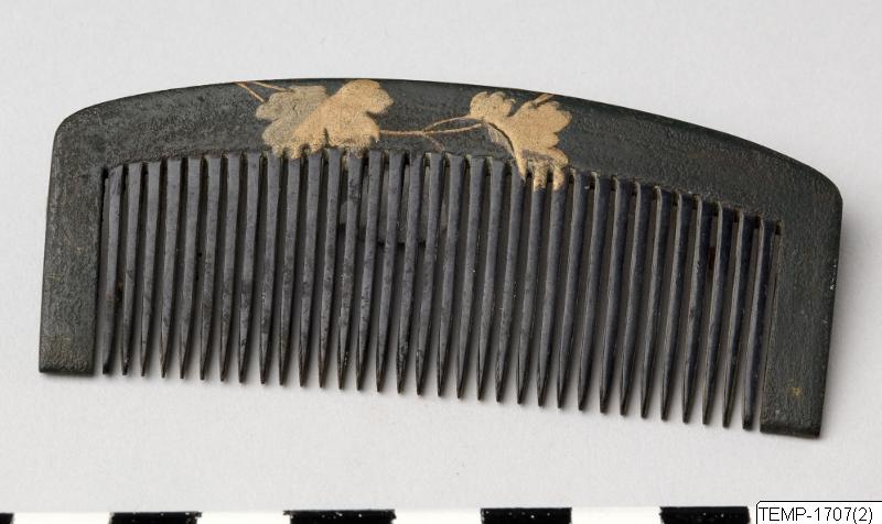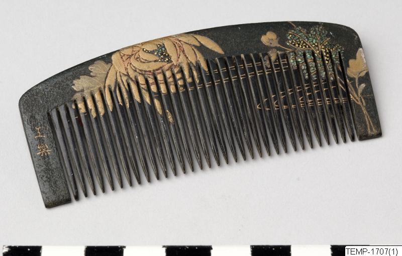 Kam med krysantemumdekor. Signerad. Lackerad i maki-e och svart lack.