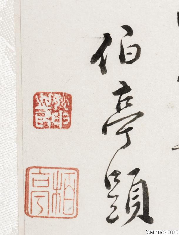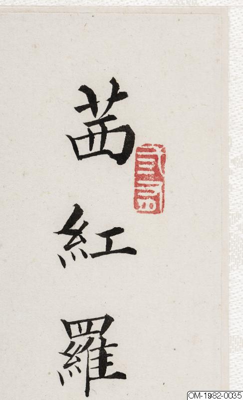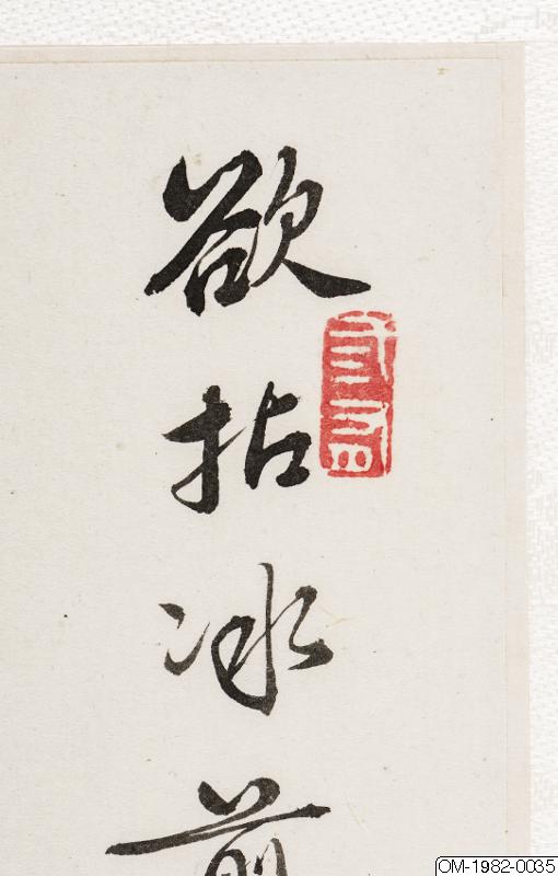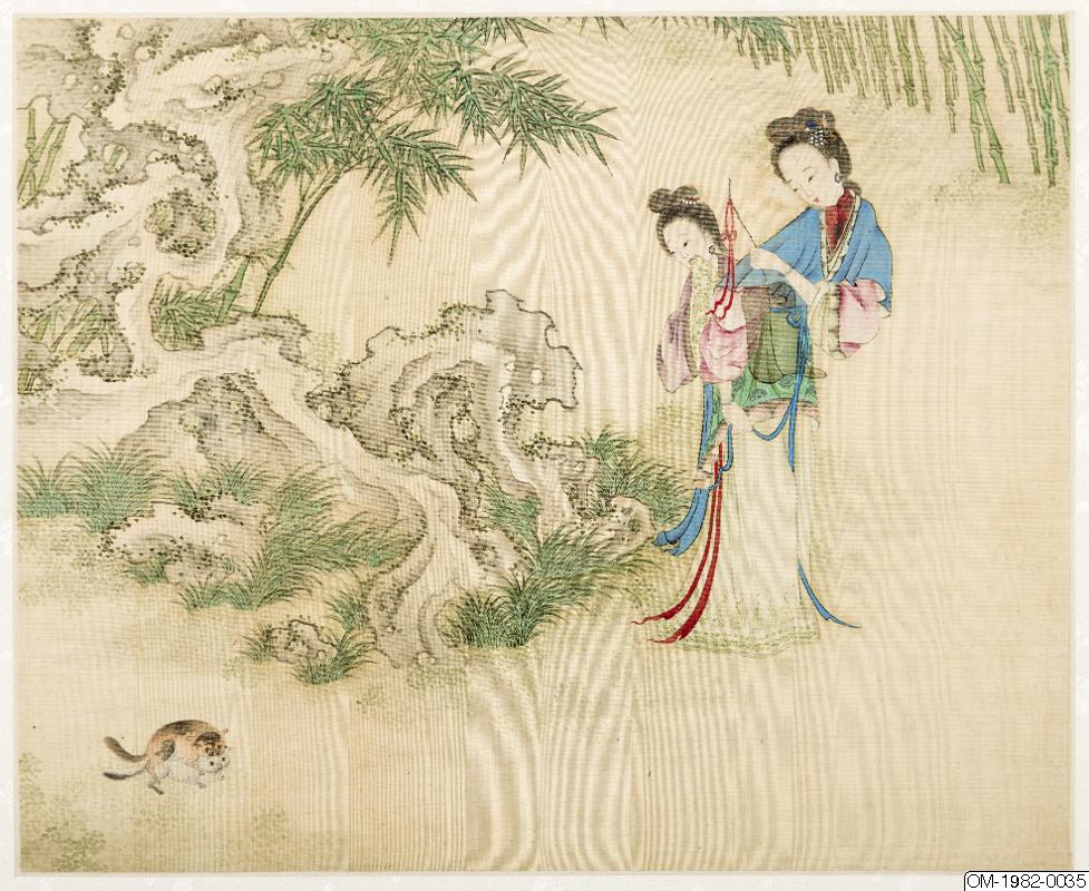6 av bilderna har inskr, på måtstående blad (tusch på papper), Motst, blad 5: "Den djupröda gauzegardinen skyddar den sköna / den ensliga kammaren är fjärran från vattenuret / förhänget lyfts-hörs rös...