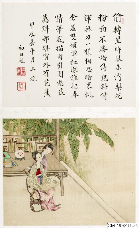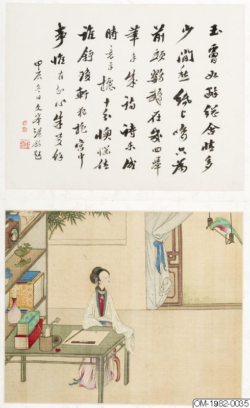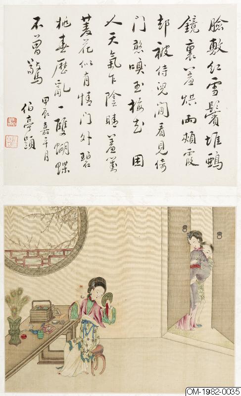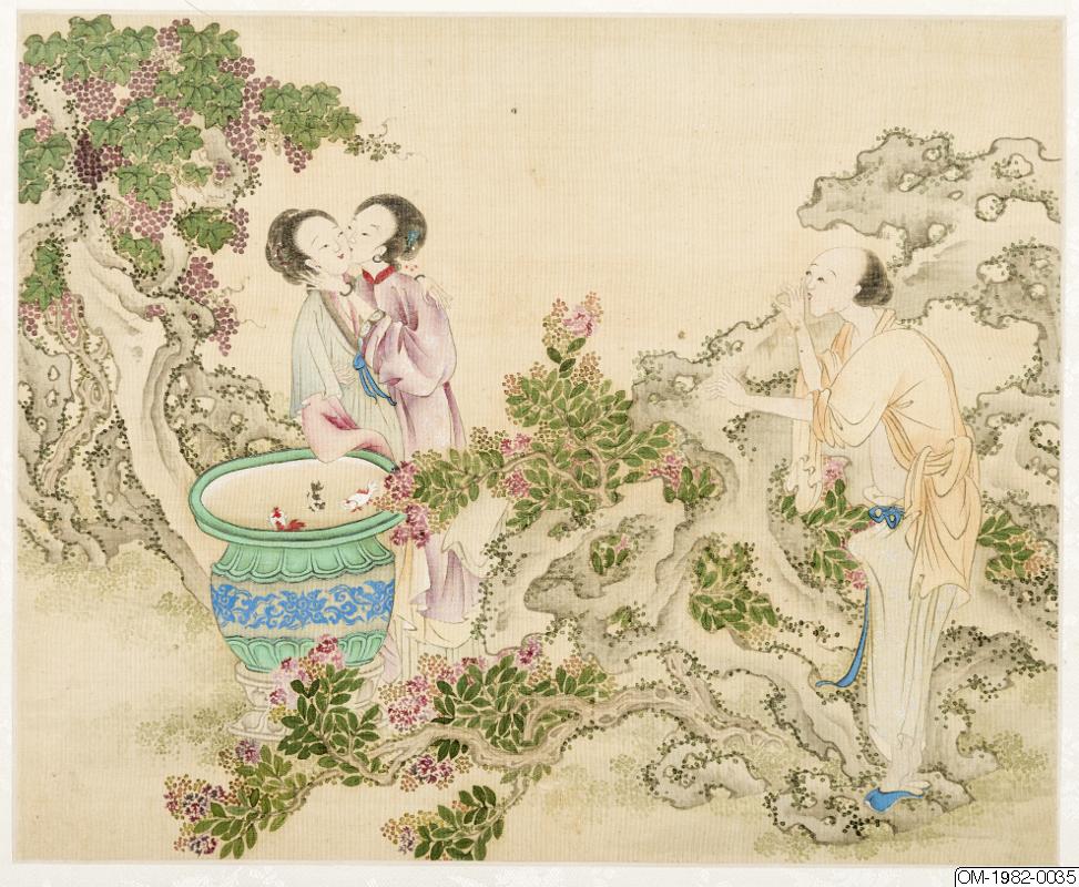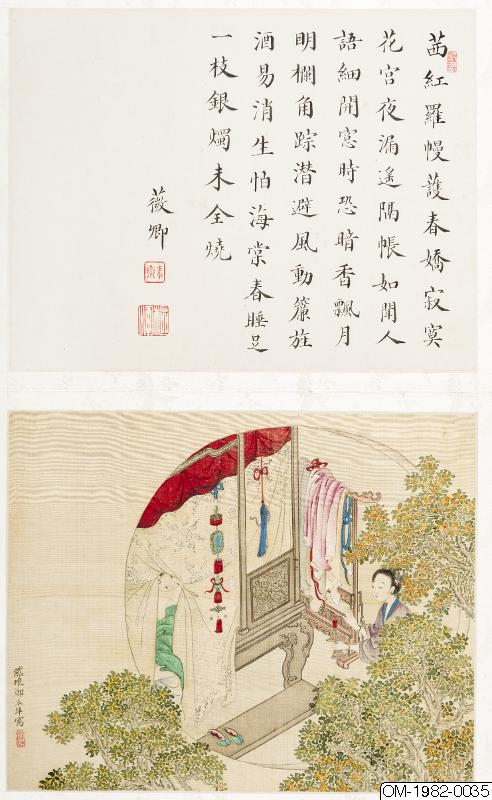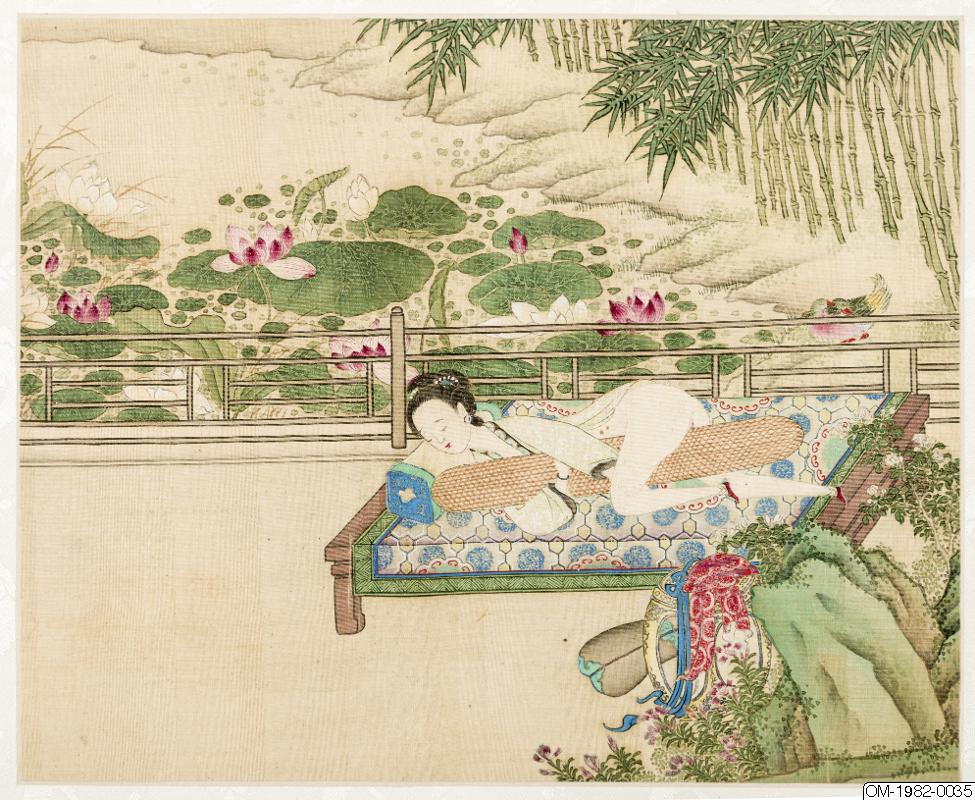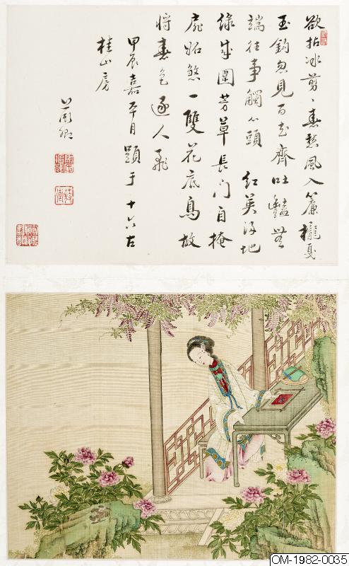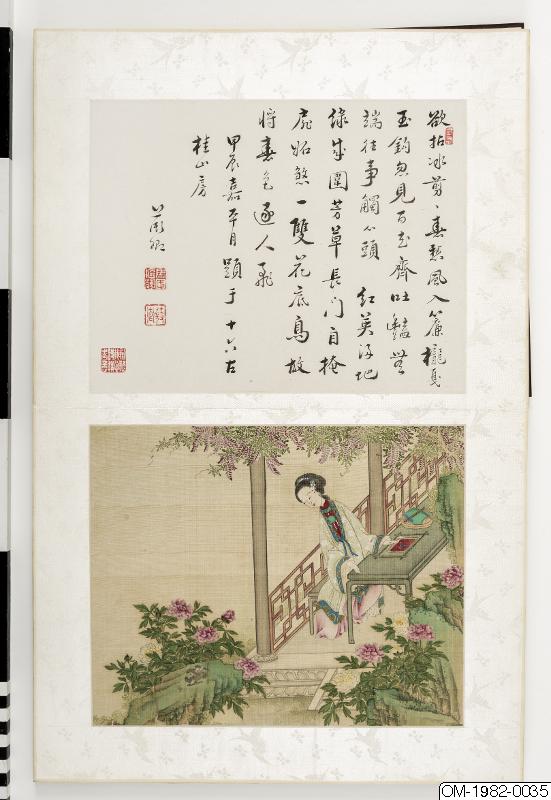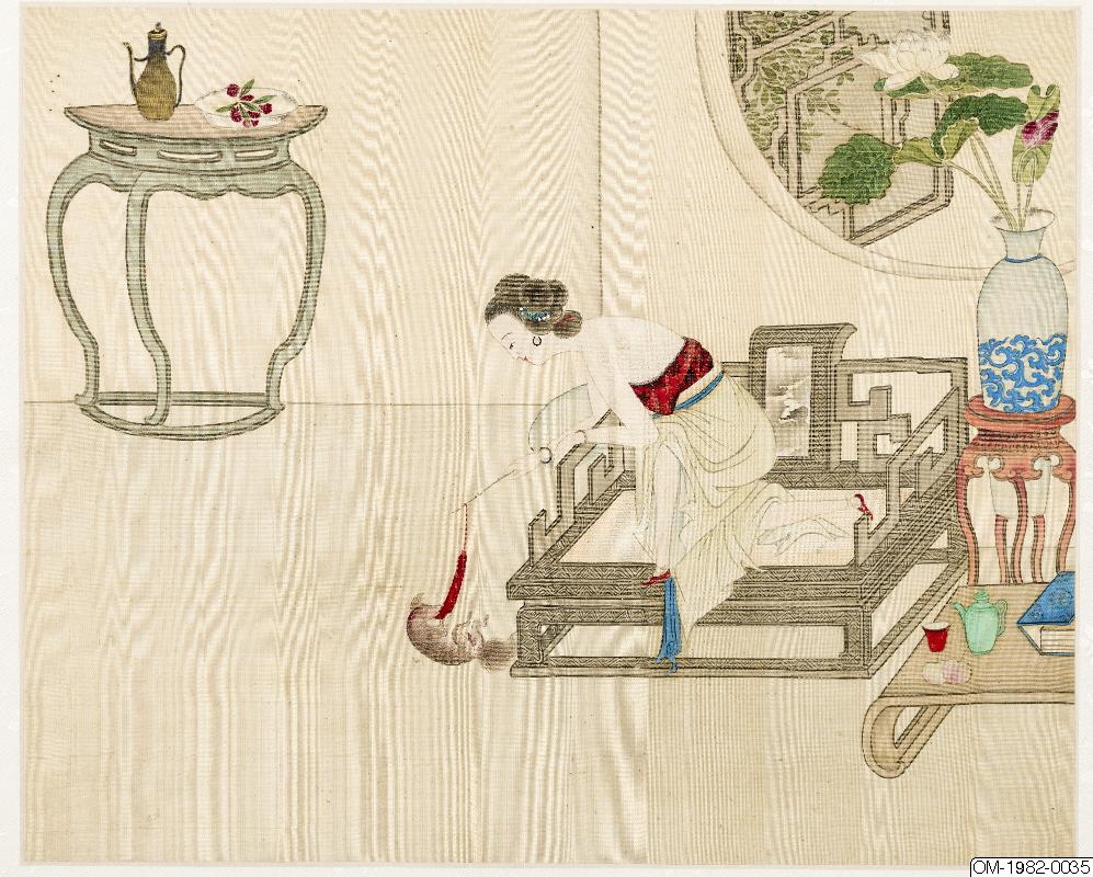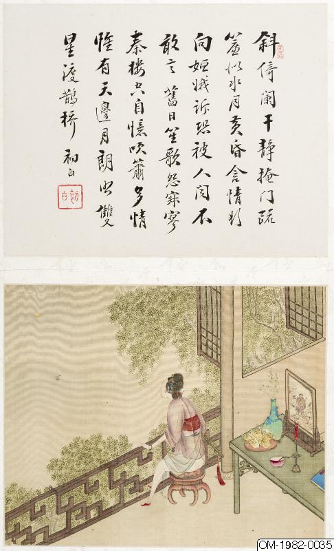 6 av bilderna har inskr, på måtstående blad (tusch på papper), Motst, blad 5: "Den djupröda gauzegardinen skyddar den sköna / den ensliga kammaren är fjärran från vattenuret / förhänget lyfts-hörs röster? / Märkvärdiga dofter spridsnär fönstret öppnas / S