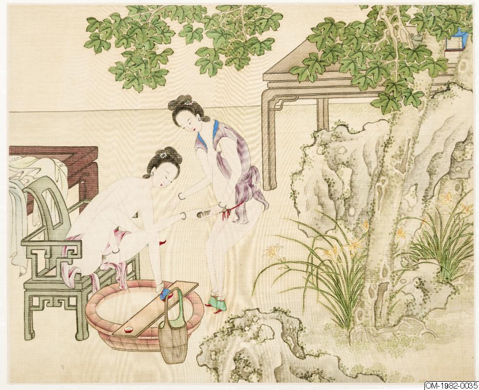 Album med erotiska motiv. 12 blad mellan sidenklädda träpärmar. Tusch och färger på siden. Motiv: Kärleksscener (kopulerande djur, attrapper etc.)