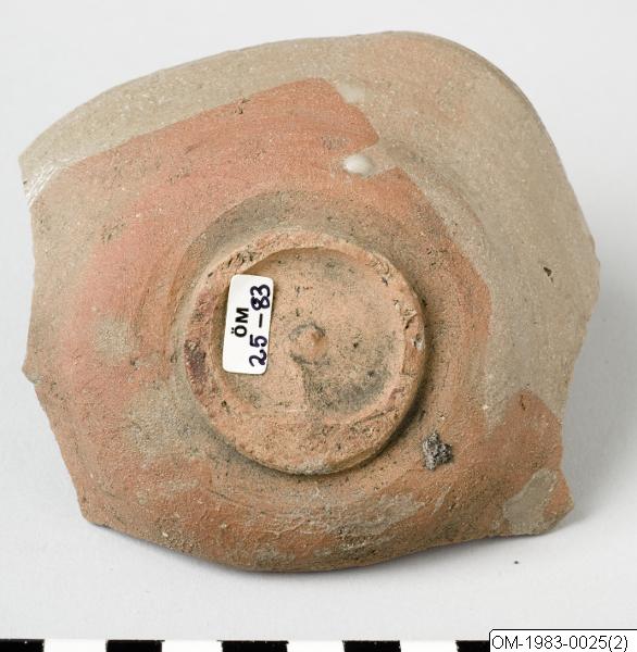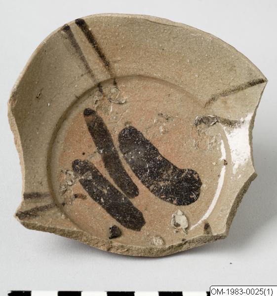 Skärva av skål. E-garatsu-vara ("Dekorerad Karatsu-vara"). Stengods med rödbrun glasyr och dekor i järnoxidbrunt. 1590-1620. Gåva av Masayuki Yamamoto, Tokyo. (Baserad på text från utställningskatalogen Japan. Föremål och bilder berättar. 2011).