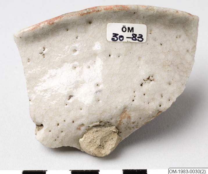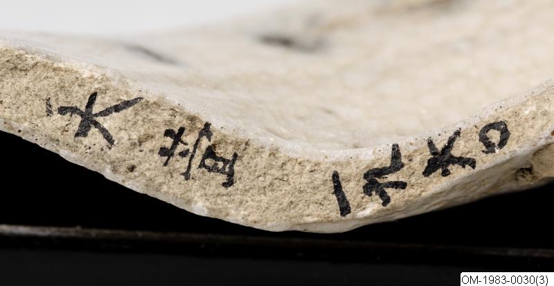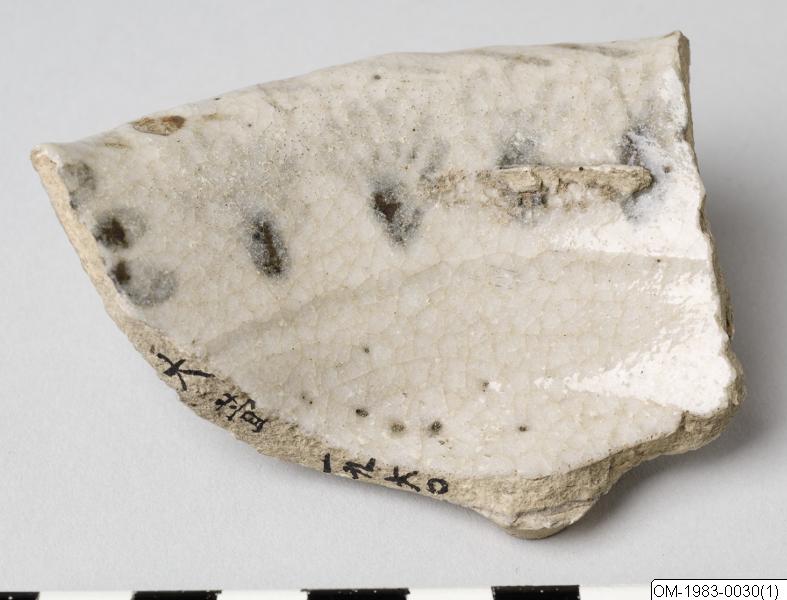 Skärva av skål.Stengods med stiliserad underglasyrdekor i gråblått.Fyndplats: Ogaya-byn, Tajimi, Gifu. Ca 1600.
