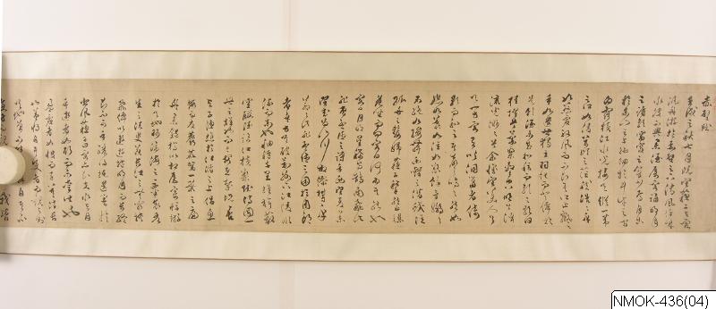 Motiv: Illustration till Su Dongpos prosapoem "Den röda klippan", där poeten jämte ett par vänner färdas i en båt på floden. Horisontalrulle. Målning i tusch med tillsats av färg på papper.