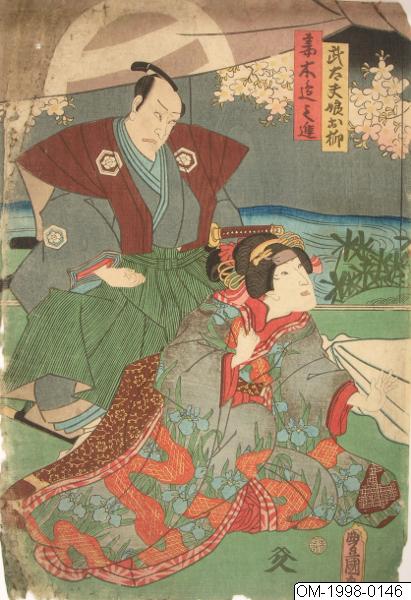 Triptyken som helhet: skådespelarna Sawamura Tosshô II som Kageyama Shigenojô (högerbild), Kawarazaki Gonjûrô I som Yaegaki Monzô (mittenbild), Iwai Kumesaburô III som Budayûs dotter Oryû och Ichikawa Kodanji IV som Tsumaki Itsunoshin (vänsterbild). 1859.