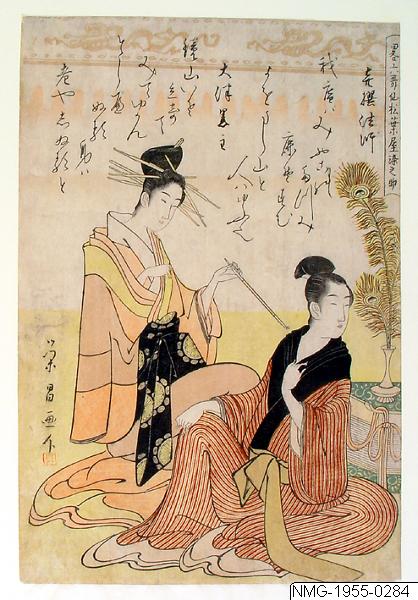 Kurtisanen Somenosuke från Matsuba-ya. Series: Ryaku rokkasen (An epitome of the 6 poets) enligt Publicerat. De sex odödliga poeterna i modern tappning, detta är vänsterbild i triptyk med poesi av Kisen Hôshi och Ôtomo no Kuronushi (mittenbild: poesi av Sôjô Henjô och Bun'ya Yasuhide, okänd kurtisan, högerbild: poesi av Ariwara Narihira och Komachi, kurtisan Hanaôgi från Ôgi-ya). 1796-1798. The Six Poetic Immortals in Modern Guise (Yatsushi Rokkasen) enligt https://collections.mfa.org/objects/502278 /PH
