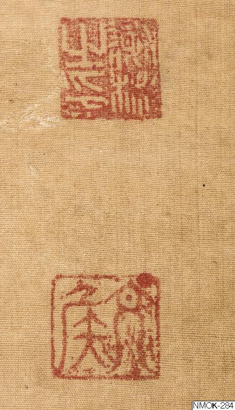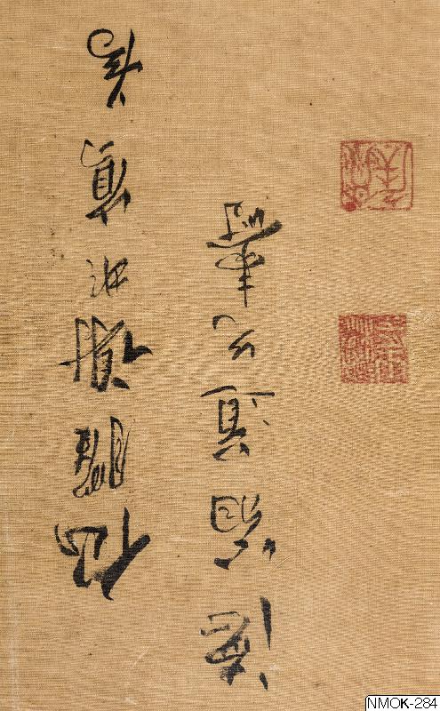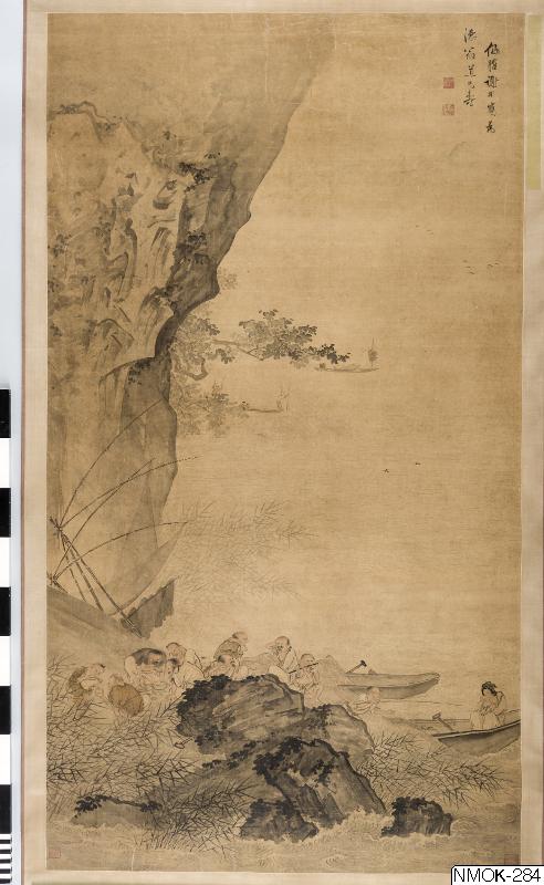 "Fiskarnas nöjen." De har förtöjt sina båtar vid klippstranden och roa sig på bästa vis med att dricka, spela och pokulera. I en av båtarna sitter en kvinna med ett barn ifamnen. På stranden är nät och andra fiskeredskap uppspända till tork. En hög bergvägg lutar fram över vattnet. Tusch och färger på siden.