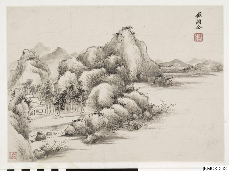 "Flodlandskap i Guan Tong's stil". Albumblad ur en serie om åtta. Tusch på papper.