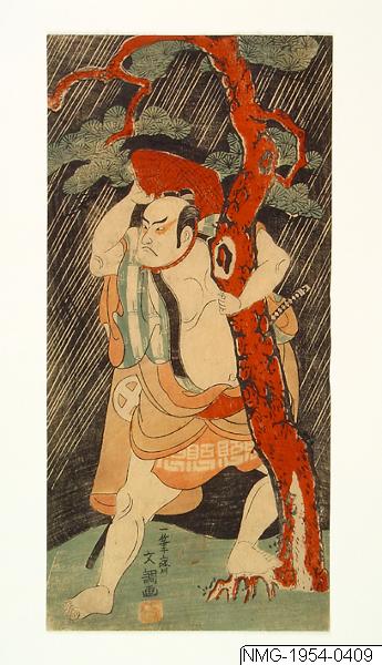 En barfota man i skogsmiljö håller något på huvudet, med katana svärd vid vänstra handen. Träsnitt av Ippitsusai Buncho. Ca 1769-1770. Troligen Otani Hiroji (III) i rollen som Shirobei på Ichimura-za-teaterns nyårsföreställning av Edo no Hana Wakayagi Soga.