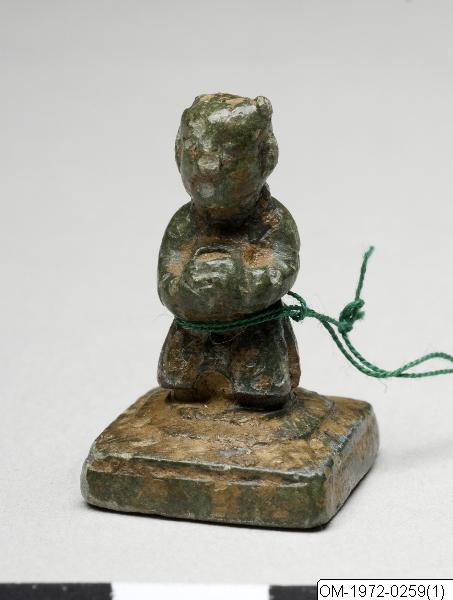 • Bottenplattan på det här sigillet är rektangulärt och ovansidan är trappformad. Handtaget i mitten föreställer en stående människofigur som är klädd i en lång kappa och håller ett skålliknande föremål i händerna. Kappans fall och figurens anletsdrag är noggrant utmärkta. Utbuktningarna på huvudet skulle kunna föreställa två hårknutar, en frisyr som kom från Kina och var vanligt bland pojkar. Staff... Visa hela
