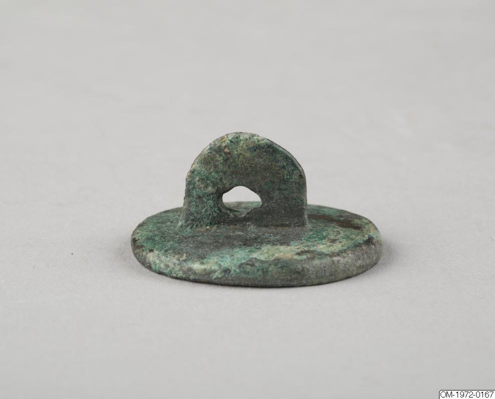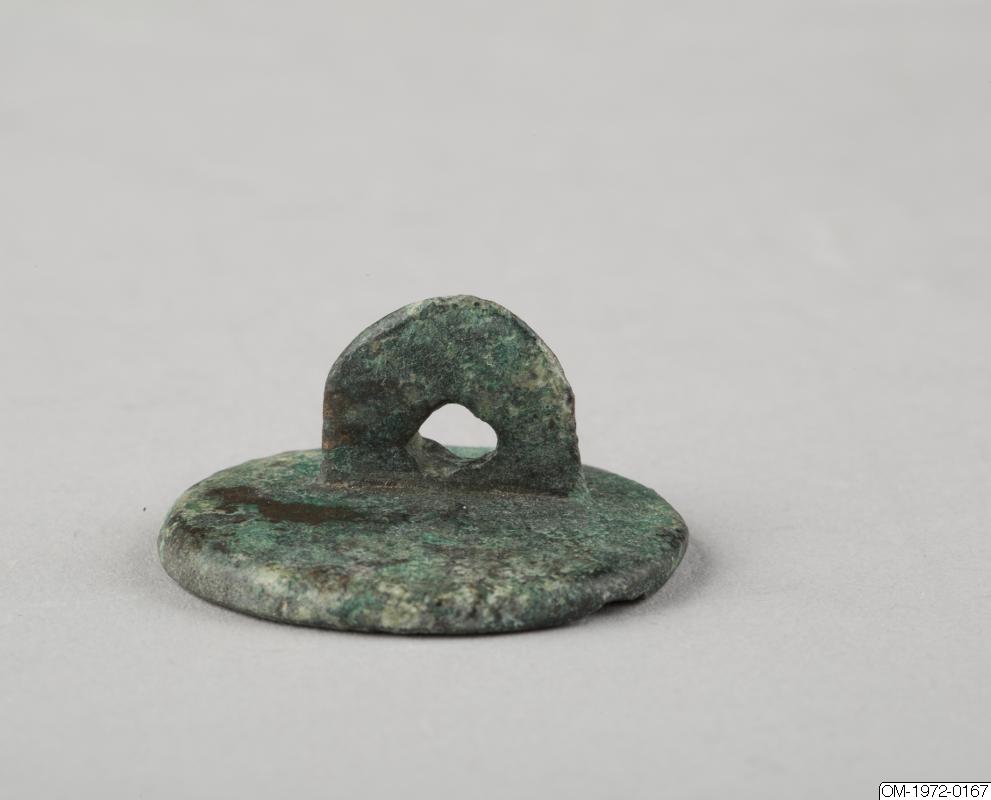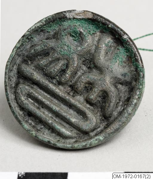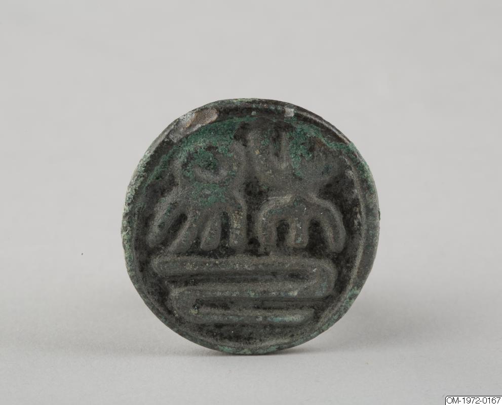 Cast in one piece, this seal has a round bottom plate and a vertically raised, arc-shaped handle on top with a hole for attaching a cord to the seal. The inscription on the stamping surface consists of two seal script characters in relief, which may represent the characters 林氏, meaning "The Im [Lim] Family." The origin of Korean seals can be traced back to China, where seals are known to have been in use since at least the Han Dynasty (206 BCE – 220 CE). The earliest Korean seals date to around the 3rd century CE (Three Kingdoms period 57 BCE – 668 CE), and it is assumed that seals started to be used from that time as a means for certifying and authenticating official and personal documents, as well as paintings and calligraphies. There were two kinds of seals: official seals used by kings, feudal lords and government offices; and private seals with names, sobriquets or excerpts from poems or classics, comparable to a personal signature. In the Goryeo Dynasty (918 – 1392), three consecutive government offices in charge of official seals were established and operated. There are no known official seals surviving from the Goryeo government because they were disposed of when the new Joseon government took over the leadership of the country in the late 14th century. However, private seals of the Goryeo period are still extant in large numbers. They are generally of bronze and consist of a bottom plate with an inscribed stamping surface and a handle that can either be simple or ornate, which allowed them to be fastened to a waist belt. Inscriptions include Chinese characters, but also symbols and geometric patterns, and are in many cases indecipherable. The inscriptions and decoration of the seals are often associated with longevity or good fortune and include Buddhist symbols. Although not much is known about their function, they were probably used for sealing envelops and documents. The Korean seal collection of the Museum of Far Eastern Antiquities includes 129 bronze seals and one stone seal, reflecting the diversity and craftsmanship of Goryeo seals. The shape of the bottom plates varies from circular to rectangular, and octagonal forms. Handle shapes include simple loops on top of the bottom plate, vertical flat handles (the majority shaped in the form of a yeouidu – a cloud-shaped symbol for good fortune) with a hole for a cord and figurative handles in the shapes of lions, fishes, tortoises, humans or birds with a hole or loop for attaching a cord. Not all inscriptions are legible, but they can be categorized into personal seals, family seals, seals with symbols and stylized characters (for example longevity, wealth or health), seals with pictorial inscriptions and seals with an inscription indicating its function (for example the character for “sealed” (Korean: bong)). In many cases, the Chinese characters are written in a stylized form with meandering lines and adapted to fit the shape of the seal plate (Korean: gucheopjeon), but other types of seal script were likewise used. Not much is known about the production process of the seals, but their examination shows that, generally, smaller seals were cast in one piece, while larger seals have separately crafted handles that were attached to the bottom plate. Some of the inscriptions were fashioned out of several metal strips that were soldered onto the bottom plate of the seal.