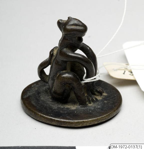 This seal has a relatively thin bottom plate and a handle in the shape of a sitting animal. The animal figure has whimsical-looking, curved legs with paws and a long tail. The animal appears to have a...