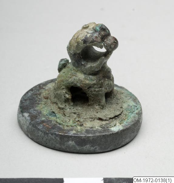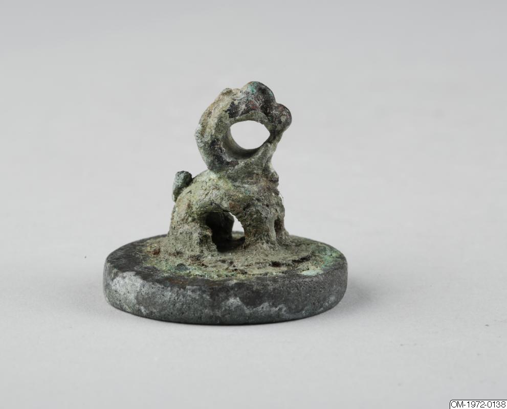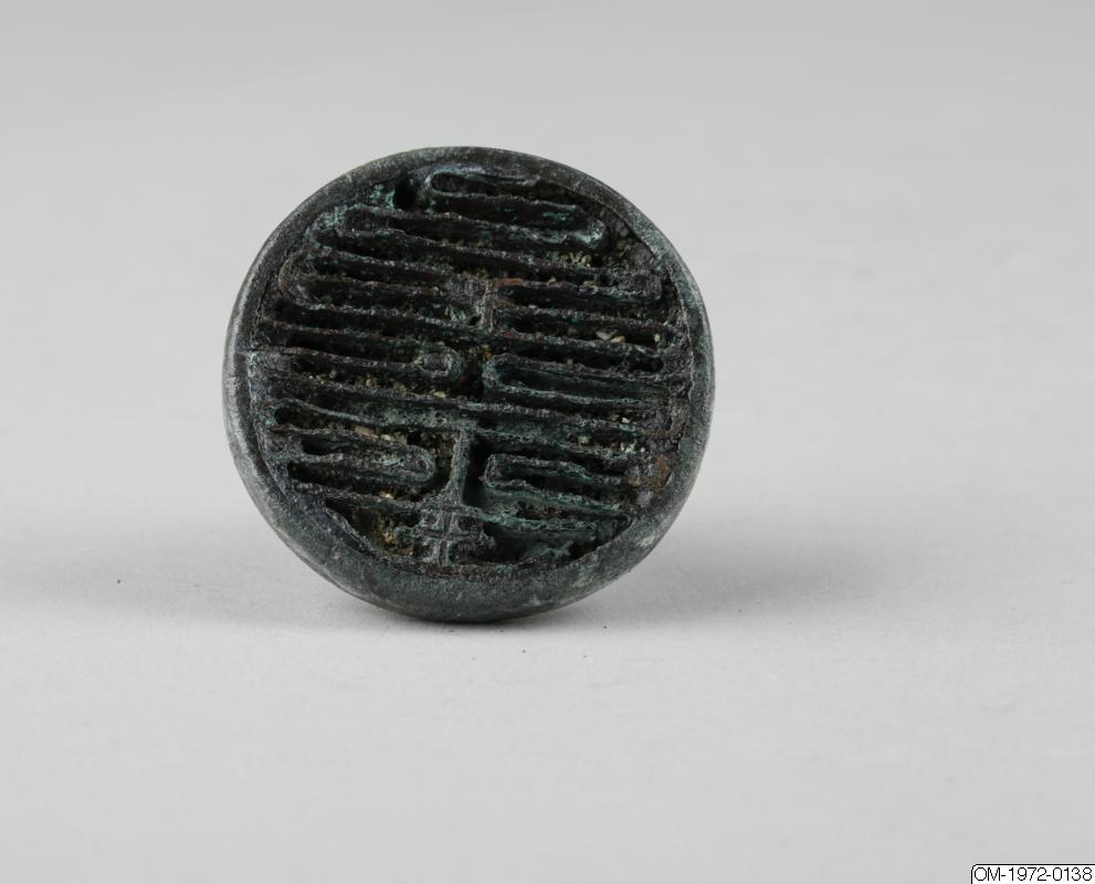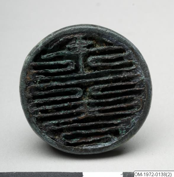 Of round shape, this seal has a handle in the form of a sitting animal, probably a lion, with a large head, and holding a pearl in its wide-open mouth. Facial features, like eyes, nose and a decorative headdress were indicated, and the fur is represented by engraved lines running down from the head to the neck. The short tail might have been originally longer but has corroded. The inscription in relief represents a stylized form of the character 壽, "longevity." The origin of Korean seals can be traced back to China, where seals are known to have been in use since at least the Han Dynasty (206 BCE – 220 CE). The earliest Korean seals date to around the 3rd century CE (Three Kingdoms period 57 BCE – 668 CE), and it is assumed that seals started to be used from that time as a means for certifying and authenticating official and personal documents, as well as paintings and calligraphies. There were two kinds of seals: official seals used by kings, feudal lords and government offices; and private seals with names, sobriquets or excerpts from poems or classics, comparable to a personal signature. In the Goryeo Dynasty (918 – 1392), three consecutive government offices in charge of official seals were established and operated. There are no known official seals surviving from the Goryeo government because they were disposed of when the new Joseon government took over the leadership of the country in the late 14th century. However, private seals of the Goryeo period are still extant in large numbers. They are generally of bronze and consist of a bottom plate with an inscribed stamping surface and a handle that can either be simple or ornate, which allowed them to be fastened to a waist belt. Inscriptions include Chinese characters, but also symbols and geometric patterns, and are in many cases indecipherable. The inscriptions and decoration of the seals are often associated with longevity or good fortune and include Buddhist symbols. Although not much is known about their function, they were probably used for sealing envelops and documents. The Korean seal collection of the Museum of Far Eastern Antiquities includes 129 bronze seals and one stone seal, reflecting the diversity and craftsmanship of Goryeo seals. The shape of the bottom plates varies from circular to rectangular, and octagonal forms. Handle shapes include simple loops on top of the bottom plate, vertical flat handles (the majority shaped in the form of a yeouidu – a cloud-shaped symbol for good fortune) with a hole for a cord and figurative handles in the shapes of lions, fishes, tortoises, humans or birds with a hole or loop for attaching a cord. Not all inscriptions are legible, but they can be categorized into personal seals, family seals, seals with symbols and stylized characters (for example longevity, wealth or health), seals with pictorial inscriptions and seals with an inscription indicating its function (for example the character for “sealed” (Korean: bong)). In many cases, the Chinese characters are written in a stylized form with meandering lines and adapted to fit the shape of the seal plate (Korean: gucheopjeon), but other types of seal script were likewise used. Not much is known about the production process of the seals, but their examination shows that, generally, smaller seals were cast in one piece, while larger seals have separately crafted handles that were attached to the bottom plate. Some of the inscriptions were fashioned out of several metal strips that were soldered onto the bottom plate of the seal.