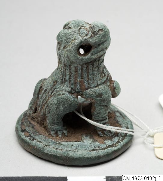 Det här sigillet består av en rund bottenplatta med ett handtag som föreställer ett sittande djur, troligtvis ett lejon. En pärla sticker ut från djurets bröst. Klor, päls, ögon och andra drag är markerade med ingraverade linjer. Vid munnen finns ett hål som troligtvis används för att knyta ett snöre till sigillet. Legenden består av en svastikasymbol i relief, omgiven av ett geometriskt mönster med snirklande linjer, också det i relief. Ursprunget till de koreanska sigillen hittar man i Kina, där man vet att sigill har används åtminstone sedan Handynastin (206 f.Kr – 220 e.Kr). De första koreanska sigillen är från omkring trehundratalet före vår tidräkning. (De tre kungarikenas tid 57 f.Kr – 668 e.Kr). Troligtvis började sigill då användas för att intyga och bestyrka både officiella och personliga dokument, samt målningar och kalligrafier. Det fanns två sorters sigill: officiella sigill som användes av kungar, feodalherrar och statliga verk, samt privata sigill med namn, smeknamn och citat från dikter eller klassiker och som användes ungefär som en signatur. Under Goryeo (918-1392) upprättades och drevs tre efter varandra följande statliga verk med ansvar för officiella sigill. Det finns inga nu kända officiella sigill som överlevt från Goryeo, eftersom den nya statsstyrelsen gjorde sig av med dem när Joseondynastin trädde till makten under det sena trettonhundratalet. Det finns däremot gott om privata sigill från Goryeo. De är vanligtvis i brons och består av en bottenplatta med en graverad stämpelyta och ett handtag som antingen är enkelt eller utsmyckat och som gjorde det möjligt att fästa sigillet vid bältet. Legenderna innefattar kinesiska tecken, men även symboler och geometriska figurer, och är i många fall otydbara. Sigillens legender och dekor är ofta relaterade till ett långt liv och välgång och innefattar även buddistiska symboler. Även om inte mycket är känt om deras funktion så användes de troligtvis till att försegla kuvert och dokument. Den koreanska sigillsamlingen på Östasiatiska museet består av 129 bronssigill och ett stensigill och speglar mångfalden och den hantverksskicklighet med vilken sigill framställdes under Goryeo. Bottenplattornas form varierar och kan vara runda, rektangulära eller åttkantiga. Handtagen består antingen av en enkel ögla på bottenplattan, en stående skiva med ett hål som användes för att fästa ett snöre vid sigillet (huvuddelen av dessa sigill är formade som en ”yeoudi” – en molnformad symbol för välgång) eller formade till avbildande figurer såsom lejon, fiskar, sköldpaddor, människor eller fåglar, även dessa med ett hål eller snörögla. Alla legender är inte i läsbart skick men sigillen kan kategoriseras i följande grupper: personliga sigill, familjesigill, sigill med symboler och stiliserade tecken (till exempel långt liv, rikedom eller hälsa) sigill med bildlegender och sigill med legender som visar sigillets funktion (exempelvis tecknet för ”förseglat” (koreanska: bong)). I många fall är de kinesiska tecknen stiliserade med snirkliga linjer anpassade till sigillplattans form (koreanska: gucheopjeon), men även andra typer av sigillskrift användes. Det är inte mycket vi vet om tillverkningsprocessen, men vanligtvis är de mindre sigillen gjutna i ett stycke medan dess att handtagen på de större sigillen ofta är gjutna för sig och har sedan fästs på bottenplattan. Några av legenderna är formade av flera metallremsor som har lötts fast på sigillets bottenplatta.