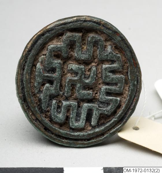 Det här sigillet består av en rund bottenplatta med ett handtag som föreställer ett sittande djur, troligtvis ett lejon. En pärla sticker ut från djurets bröst. Klor, päls, ögon och andra drag är markerade med ingraverade linjer. Vid munnen finns ett hål som troligtvis används för att knyta ett snöre till sigillet. Legenden består av en svastikasymbol i relief, omgiven av ett geometriskt mönster m...
