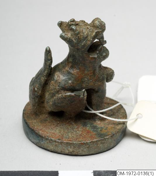 This seal consists of a round bottom plate and a handle in the shape of a sitting, lion-like animal. With its front legs firmly on the ground and the tail raised upward, this lion figure has carefully...