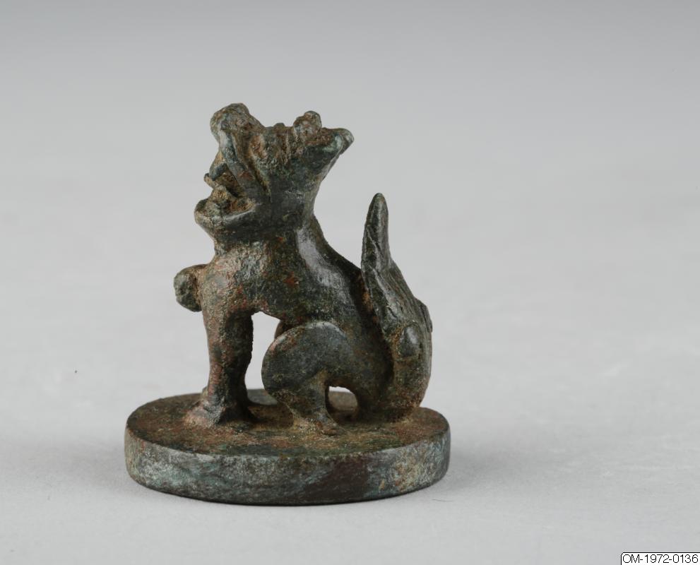 This seal consists of a round bottom plate and a handle in the shape of a sitting, lion-like animal. With its front legs firmly on the ground and the tail raised upward, this lion figure has carefully rendered features: curls in the tail, the eyes, nose, and mouth with teeth and tongue are explicitly detailed. A pearl protrudes from the chest of the animal. There is no loop or hole for tying a cord to the seal as seen in other seals in the collection. The character inscribed in relief onto the stamping surface is probably a seal script version of the character 康, meaning "health." The origin of Korean seals can be traced back to China, where seals are known to have been in use since at least the Han Dynasty (206 BCE – 220 CE). The earliest Korean seals date to around the 3rd century CE (Three Kingdoms period 57 BCE – 668 CE), and it is assumed that seals started to be used from that time as a means for certifying and authenticating official and personal documents, as well as paintings and calligraphies. There were two kinds of seals: official seals used by kings, feudal lords and government offices; and private seals with names, sobriquets or excerpts from poems or classics, comparable to a personal signature. In the Goryeo Dynasty (918 – 1392), three consecutive government offices in charge of official seals were established and operated. There are no known official seals surviving from the Goryeo government because they were disposed of when the new Joseon government took over the leadership of the country in the late 14th century. However, private seals of the Goryeo period are still extant in large numbers. They are generally of bronze and consist of a bottom plate with an inscribed stamping surface and a handle that can either be simple or ornate, which allowed them to be fastened to a waist belt. Inscriptions include Chinese characters, but also symbols and geometric patterns, and are in many cases indecipherable. The inscriptions and decoration of the seals are often associated with longevity or good fortune and include Buddhist symbols. Although not much is known about their function, they were probably used for sealing envelops and documents. The Korean seal collection of the Museum of Far Eastern Antiquities includes 129 bronze seals and one stone seal, reflecting the diversity and craftsmanship of Goryeo seals. The shape of the bottom plates varies from circular to rectangular, and octagonal forms. Handle shapes include simple loops on top of the bottom plate, vertical flat handles (the majority shaped in the form of a yeouidu – a cloud-shaped symbol for good fortune) with a hole for a cord and figurative handles in the shapes of lions, fishes, tortoises, humans or birds with a hole or loop for attaching a cord. Not all inscriptions are legible, but they can be categorized into personal seals, family seals, seals with symbols and stylized characters (for example longevity, wealth or health), seals with pictorial inscriptions and seals with an inscription indicating its function (for example the character for “sealed” (Korean: bong)). In many cases, the Chinese characters are written in a stylized form with meandering lines and adapted to fit the shape of the seal plate (Korean: gucheopjeon), but other types of seal script were likewise used. Not much is known about the production process of the seals, but their examination shows that, generally, smaller seals were cast in one piece, while larger seals have separately crafted handles that were attached to the bottom plate. Some of the inscriptions were fashioned out of several metal strips that were soldered onto the bottom plate of the seal.