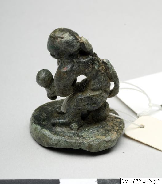 • Det här sigillets handtag är fäst på en ganska liten bottenplatta och är format som ett djur som sitter på ett klot och håller ett föremål, som skulle kunna föreställa en pärla, mellan tassarna. Även om figuren inte har några utmärkande drag är det, med utgångspunkt i jämförelse med sigill av keramik från samma tidsperiod, troligt att det föreställer en apa Uppe på figurens nacke finns en liten ög... Visa hela