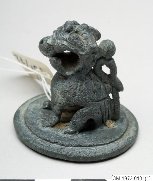 Det här sigillet har en rund bottenplatta med trappformade kanter. Handtaget föreställer ett sittande djur, troligen ett lejon. Huvudet är oproportionerligt stort och de rundade öronen, de utstående ögonen, näsan och munnen i vilken djuret håller en pärla är tydligt markerade. Munöppningen bakom pärlan kan ha fungerat som ögla för att knyta ett snöre till sigillet. Inristade linjer på kroppen före...