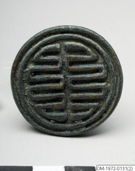 This seal has a round bottom plate with stepped edges. The handle has the form of a sitting animal, possibly a lion. The head is disproportionately large and the facial features, the rounded ears, bulging eyes, the nose and the mouth holding a pearl, are clearly indicated. The opening of the mouth behind the pearl might have served as a loop for tying a cord to the seal. Incised lines on the body represent fur. The tail is long and describes a loop. At the back of the head, above the tail, there is another pearl. The stamping surface is inscribed in relief with a stylized form of the character for "longevity," 壽. The origin of Korean seals can be traced back to China, where seals are known to have been in use since at least the Han Dynasty (206 BCE – 220 CE). The earliest Korean seals date to around the 3rd century CE (Three Kingdoms period 57 BCE – 668 CE), and it is assumed that seals started to be used from that time as a means for certifying and authenticating official and personal documents, as well as paintings and calligraphies. There were two kinds of seals: official seals used by kings, feudal lords and government offices; and private seals with names, sobriquets or excerpts from poems or classics, comparable to a personal signature. In the Goryeo Dynasty (918 – 1392), three consecutive government offices in charge of official seals were established and operated. There are no known official seals surviving from the Goryeo government because they were disposed of when the new Joseon government took over the leadership of the country in the late 14th century. However, private seals of the Goryeo period are still extant in large numbers. They are generally of bronze and consist of a bottom plate with an inscribed stamping surface and a handle that can either be simple or ornate, which allowed them to be fastened to a waist belt. Inscriptions include Chinese characters, but also symbols and geometric patterns, and are in many cases indecipherable. The inscriptions and decoration of the seals are often associated with longevity or good fortune and include Buddhist symbols. Although not much is known about their function, they were probably used for sealing envelops and documents. The Korean seal collection of the Museum of Far Eastern Antiquities includes 129 bronze seals and one stone seal, reflecting the diversity and craftsmanship of Goryeo seals. The shape of the bottom plates varies from circular to rectangular, and octagonal forms. Handle shapes include simple loops on top of the bottom plate, vertical flat handles (the majority shaped in the form of a yeouidu – a cloud-shaped symbol for good fortune) with a hole for a cord and figurative handles in the shapes of lions, fishes, tortoises, humans or birds with a hole or loop for attaching a cord. Not all inscriptions are legible, but they can be categorized into personal seals, family seals, seals with symbols and stylized characters (for example longevity, wealth or health), seals with pictorial inscriptions and seals with an inscription indicating its function (for example the character for “sealed” (Korean: bong)). In many cases, the Chinese characters are written in a stylized form with meandering lines and adapted to fit the shape of the seal plate (Korean: gucheopjeon), but other types of seal script were likewise used. Not much is known about the production process of the seals, but their examination shows that, generally, smaller seals were cast in one piece, while larger seals have separately crafted handles that were attached to the bottom plate. Some of the inscriptions were fashioned out of several metal strips that were soldered onto the bottom plate of the seal.