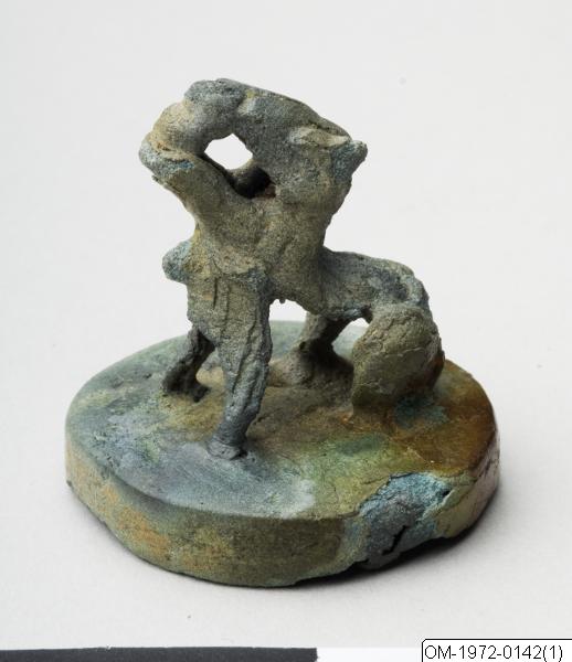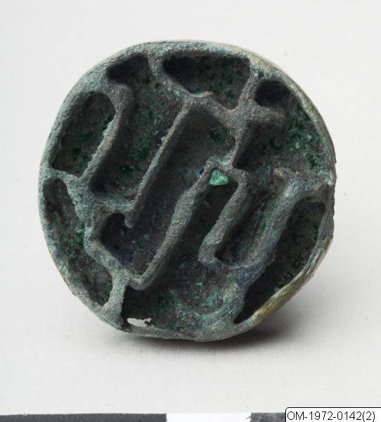 Compared to the other seals in the collection, the round bottom plate of this seal is thick and wide, and the animal-shaped handle is large. The lion-like animal figure is represented in a sitting position, with a pearl attached to the chest and another pearl held in the large mouth. The physique of the animal is highly stylized; the head is large without any detailed features. Strands of fur are indicated with parallel lines along the head and the body. The stamping surface bears an irregular pattern in relief. The origin of Korean seals can be traced back to China, where seals are known to have been in use since at least the Han Dynasty (206 BCE – 220 CE). The earliest Korean seals date to around the 3rd century CE (Three Kingdoms period 57 BCE – 668 CE), and it is assumed that seals started to be used from that time as a means for certifying and authenticating official and personal documents, as well as paintings and calligraphies. There were two kinds of seals: official seals used by kings, feudal lords and government offices; and private seals with names, sobriquets or excerpts from poems or classics, comparable to a personal signature. In the Goryeo Dynasty (918 – 1392), three consecutive government offices in charge of official seals were established and operated. There are no known official seals surviving from the Goryeo government because they were disposed of when the new Joseon government took over the leadership of the country in the late 14th century. However, private seals of the Goryeo period are still extant in large numbers. They are generally of bronze and consist of a bottom plate with an inscribed stamping surface and a handle that can either be simple or ornate, which allowed them to be fastened to a waist belt. Inscriptions include Chinese characters, but also symbols and geometric patterns, and are in many cases indecipherable. The inscriptions and decoration of the seals are often associated with longevity or good fortune and include Buddhist symbols. Although not much is known about their function, they were probably used for sealing envelops and documents. The Korean seal collection of the Museum of Far Eastern Antiquities includes 129 bronze seals and one stone seal, reflecting the diversity and craftsmanship of Goryeo seals. The shape of the bottom plates varies from circular to rectangular, and octagonal forms. Handle shapes include simple loops on top of the bottom plate, vertical flat handles (the majority shaped in the form of a yeouidu – a cloud-shaped symbol for good fortune) with a hole for a cord and figurative handles in the shapes of lions, fishes, tortoises, humans or birds with a hole or loop for attaching a cord. Not all inscriptions are legible, but they can be categorized into personal seals, family seals, seals with symbols and stylized characters (for example longevity, wealth or health), seals with pictorial inscriptions and seals with an inscription indicating its function (for example the character for “sealed” (Korean: bong)). In many cases, the Chinese characters are written in a stylized form with meandering lines and adapted to fit the shape of the seal plate (Korean: gucheopjeon), but other types of seal script were likewise used. Not much is known about the production process of the seals, but their examination shows that, generally, smaller seals were cast in one piece, while larger seals have separately crafted handles that were attached to the bottom plate. Some of the inscriptions were fashioned out of several metal strips that were soldered onto the bottom plate of the seal.