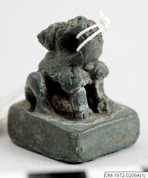 Det här är ett litet sigill med tjock, rektangulär bottenplatta. Det djurformade handtaget föreställer troligtvis ett sittande lejon. Även om det inte speciellt detaljrikt så är nos, ögon, öron och även klor på tassarna tydligt utmärkta. Djurets huvud är upplyft och en pärla syns mitt på djurets bröst. Ett hål har borrats genom huvudet vid munnen och skulle kunna ha fungerat som snörhål. Legenden i relief föreställer ett snirkligt mönster. Det skulle kunna föreställa ett hårt stiliserat tecken:龍, som betyder ”drake” (jämför med legenden på sigillet med nummer OM-1972-0140).Ursprunget till de koreanska sigillen hittar man i Kina, där man vet att sigill har används åtminstone sedan Handynastin (206 f.Kr – 220 e.Kr). De första koreanska sigillen är från omkring trehundratalet före vår tidräkning. (De tre kungarikenas tid 57 f.Kr – 668 e.Kr). Troligtvis började sigill då användas för att intyga och bestyrka både officiella och personliga dokument, samt målningar och kalligrafier. Det fanns två sorters sigill: officiella sigill som användes av kungar, feodalherrar och statliga verk, samt privata sigill med namn, smeknamn och citat från dikter eller klassiker och som användes ungefär som en signatur. Under Goryeo (918-1392) upprättades och drevs tre efter varandra följande statliga verk med ansvar för officiella sigill. Det finns inga nu kända officiella sigill som överlevt från Goryeo, eftersom den nya statsstyrelsen gjorde sig av med dem när Joseondynastin trädde till makten under det sena trettonhundratalet. Det finns däremot gott om privata sigill från Goryeo. De är vanligtvis i brons och består av en bottenplatta med en graverad stämpelyta och ett handtag som antingen är enkelt eller utsmyckat och som gjorde det möjligt att fästa sigillet vid bältet. Legenderna innefattar kinesiska tecken, men även symboler och geometriska figurer, och är i många fall otydbara. Sigillens legender och dekor är ofta relaterade till ett långt liv och välgång och innefattar även buddistiska symboler. Även om inte mycket är känt om deras funktion så användes de troligtvis till att försegla kuvert och dokument. Den koreanska sigillsamlingen på Östasiatiska museet består av 129 bronssigill och ett stensigill och speglar mångfalden och den hantverksskicklighet med vilken sigill framställdes under Goryeo. Bottenplattornas form varierar och kan vara runda, rektangulära eller åttkantiga. Handtagen består antingen av en enkel ögla på bottenplattan, en stående skiva med ett hål som användes för att fästa ett snöre vid sigillet (huvuddelen av dessa sigill är formade som en ”yeoudi” – en molnformad symbol för välgång) eller formade till avbildande figurer såsom lejon, fiskar, sköldpaddor, människor eller fåglar, även dessa med ett hål eller snörögla. Alla legender är inte i läsbart skick men sigillen kan kategoriseras i följande grupper: personliga sigill, familjesigill, sigill med symboler och stiliserade tecken (till exempel långt liv, rikedom eller hälsa) sigill med bildlegender och sigill med legender som visar sigillets funktion (exempelvis tecknet för ”förseglat” (koreanska: bong)). I många fall är de kinesiska tecknen stiliserade med snirkliga linjer anpassade till sigillplattans form (koreanska: gucheopjeon), men även andra typer av sigillskrift användes. Det är inte mycket vi vet om tillverkningsprocessen, men vanligtvis är de mindre sigillen gjutna i ett stycke medan dess att handtagen på de större sigillen ofta är gjutna för sig och har sedan fästs på bottenplattan. Några av legenderna är formade av flera metallremsor som har lötts fast på sigillets bottenplatta.