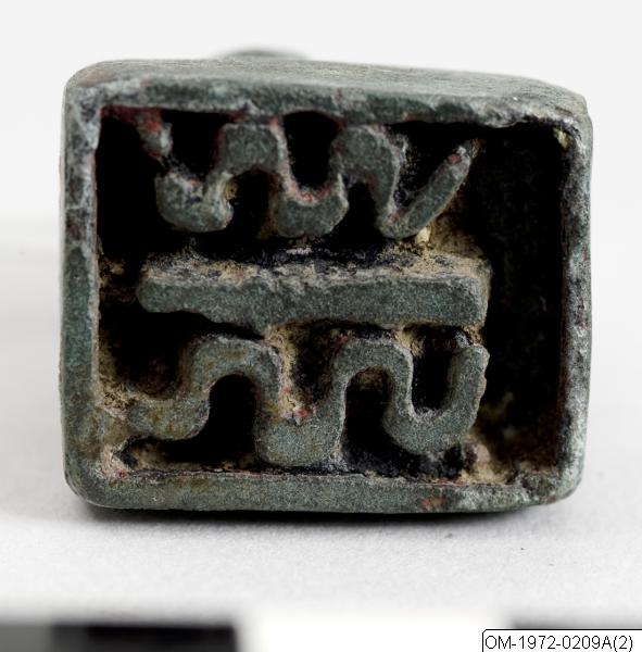 This small seal has a thick, rectangular bottom plate. The animal-shaped handle probably depicts a sitting lion. Although not much attention was given to detail, the snout, eyes, ears and even claws on the paws are clearly indicated. The head of the animal is lifted up, exposing a pearl at the centre of the chest. A hole was drilled through the head at the location of the mouth, which could facilitate the tying of a cord to the seal. The stamping surface bears a pattern with meandering lines. It may represent a highly stylized version of the character 龍, meaning "dragon" (compare with the inscription in seal number OM-1972-0140). The origin of Korean seals can be traced back to China, where seals are known to have been in use since at least the Han Dynasty (206 BCE – 220 CE). The earliest Korean seals date to around the 3rd century CE (Three Kingdoms period 57 BCE – 668 CE), and it is assumed that seals started to be used from that time as a means for certifying and authenticating official and personal documents, as well as paintings and calligraphies. There were two kinds of seals: official seals used by kings, feudal lords and government offices; and private seals with names, sobriquets or excerpts from poems or classics, comparable to a personal signature. In the Goryeo Dynasty (918 – 1392), three consecutive government offices in charge of official seals were established and operated. There are no known official seals surviving from the Goryeo government because they were disposed of when the new Joseon government took over the leadership of the country in the late 14th century. However, private seals of the Goryeo period are still extant in large numbers. They are generally of bronze and consist of a bottom plate with an inscribed stamping surface and a handle that can either be simple or ornate, which allowed them to be fastened to a waist belt. Inscriptions include Chinese characters, but also symbols and geometric patterns, and are in many cases indecipherable. The inscriptions and decoration of the seals are often associated with longevity or good fortune and include Buddhist symbols. Although not much is known about their function, they were probably used for sealing envelops and documents. The Korean seal collection of the Museum of Far Eastern Antiquities includes 129 bronze seals and one stone seal, reflecting the diversity and craftsmanship of Goryeo seals. The shape of the bottom plates varies from circular to rectangular, and octagonal forms. Handle shapes include simple loops on top of the bottom plate, vertical flat handles (the majority shaped in the form of a yeouidu – a cloud-shaped symbol for good fortune) with a hole for a cord and figurative handles in the shapes of lions, fishes, tortoises, humans or birds with a hole or loop for attaching a cord. Not all inscriptions are legible, but they can be categorized into personal seals, family seals, seals with symbols and stylized characters (for example longevity, wealth or health), seals with pictorial inscriptions and seals with an inscription indicating its function (for example the character for “sealed” (Korean: bong)). In many cases, the Chinese characters are written in a stylized form with meandering lines and adapted to fit the shape of the seal plate (Korean: gucheopjeon), but other types of seal script were likewise used. Not much is known about the production process of the seals, but their examination shows that, generally, smaller seals were cast in one piece, while larger seals have separately crafted handles that were attached to the bottom plate. Some of the inscriptions were fashioned out of several metal strips that were soldered onto the bottom plate of the seal.